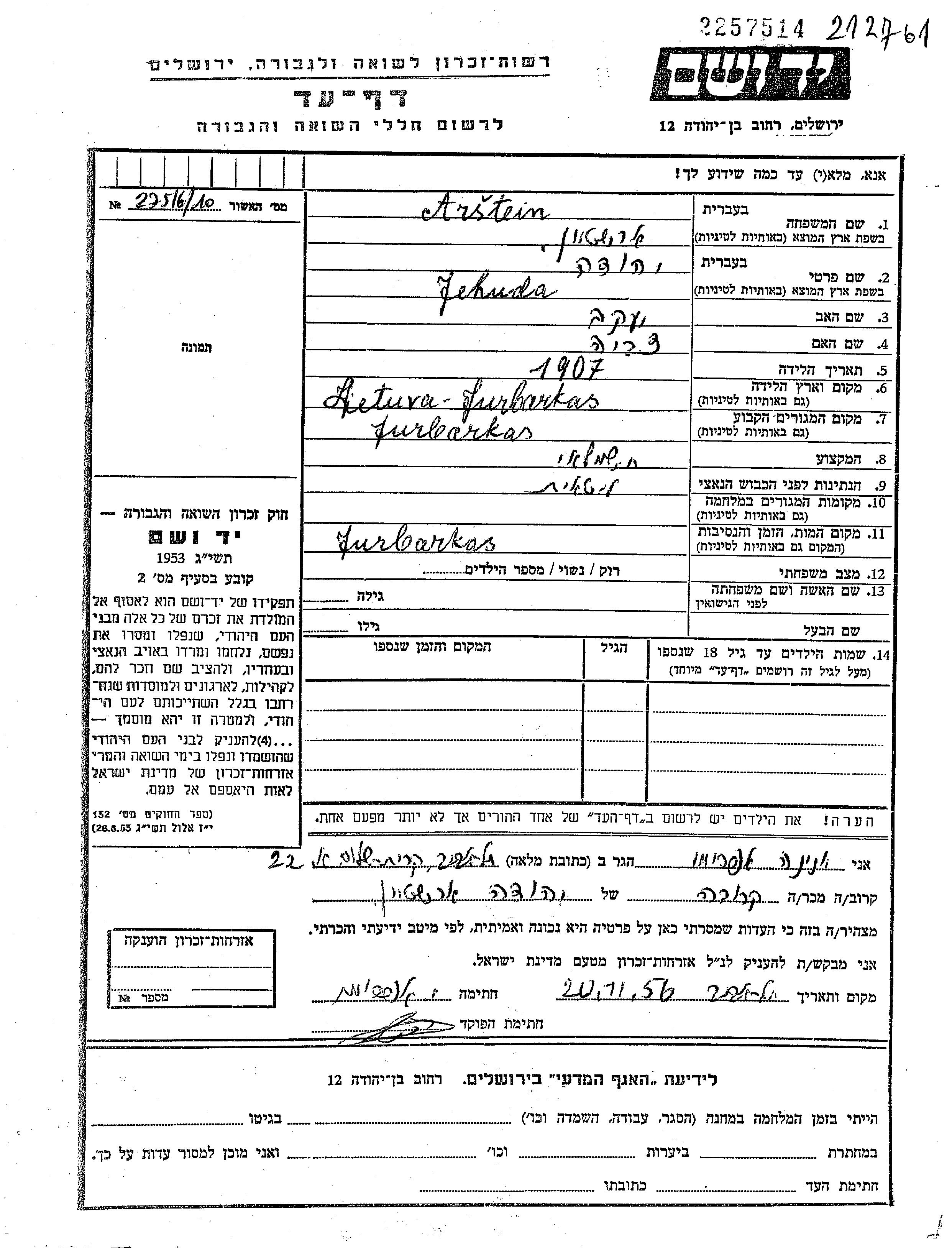 Arshtein Jehuda 1907 Jurbarkas, Lituanie Feuille de témoignage