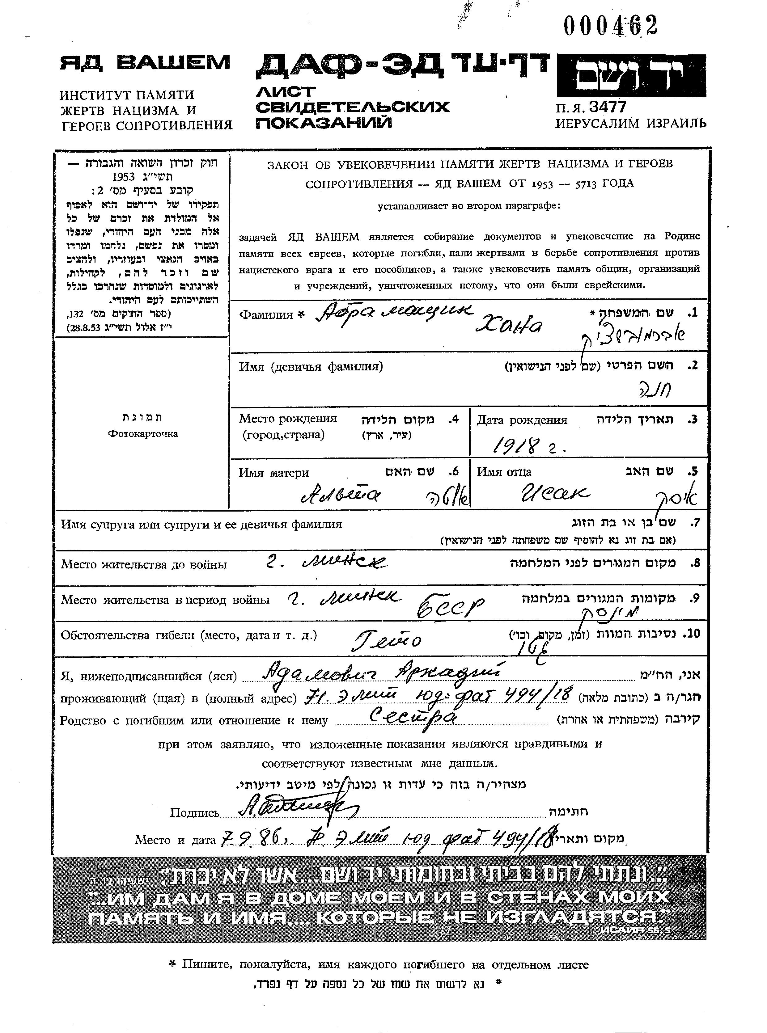 Abramovshchik Khana 1918 Minsk, Bélorussie (URSS) Feuille de témoignage