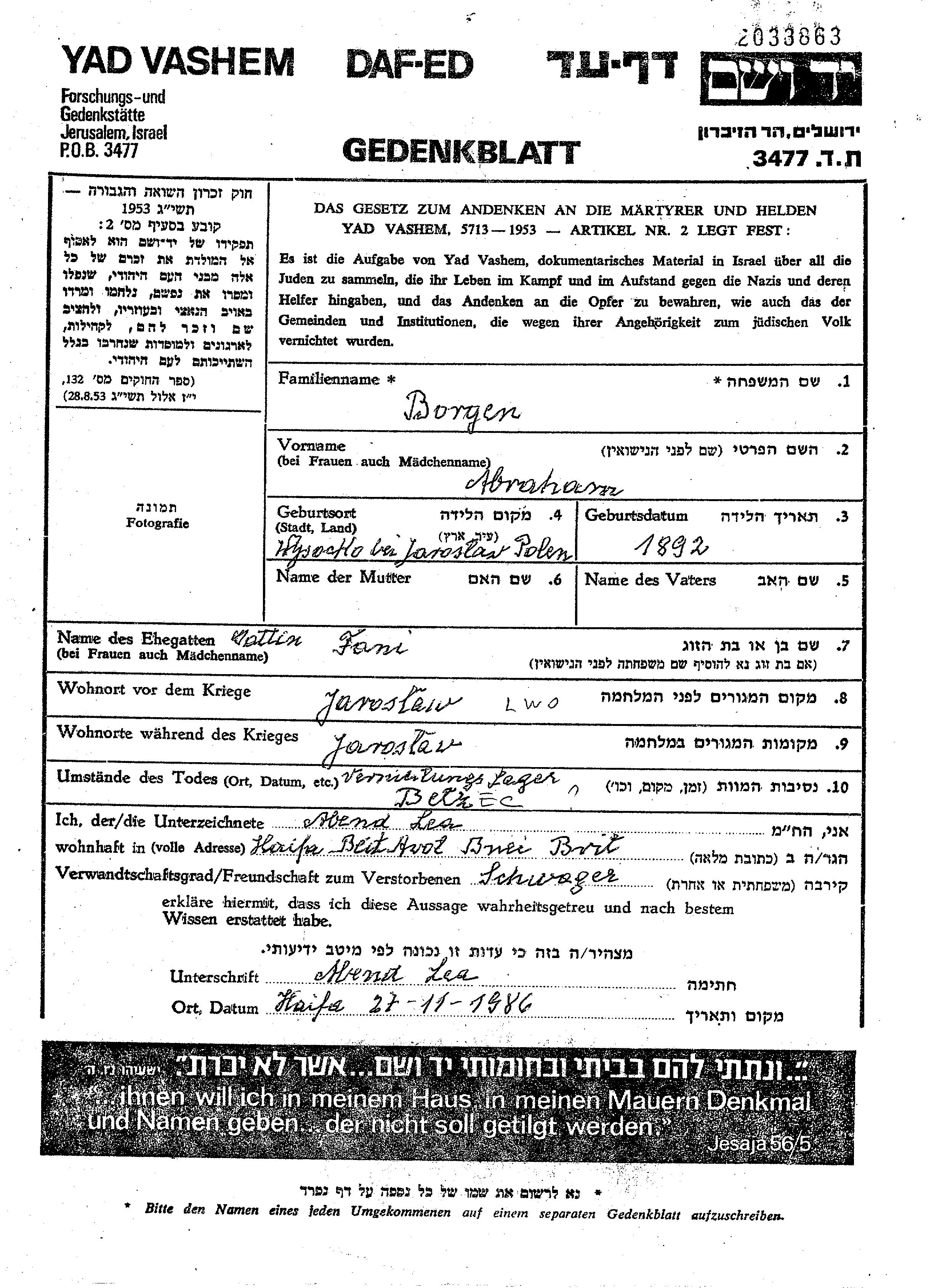 Abraham Borgen est né à Wysocko, Pologne en 1892. Il était Mariée à Fani. Avant la seconde guerre mondiale il vivait à Jaroslaw, Pologne. Au cours de la guerre, il était à Jaroslaw, Pologne.