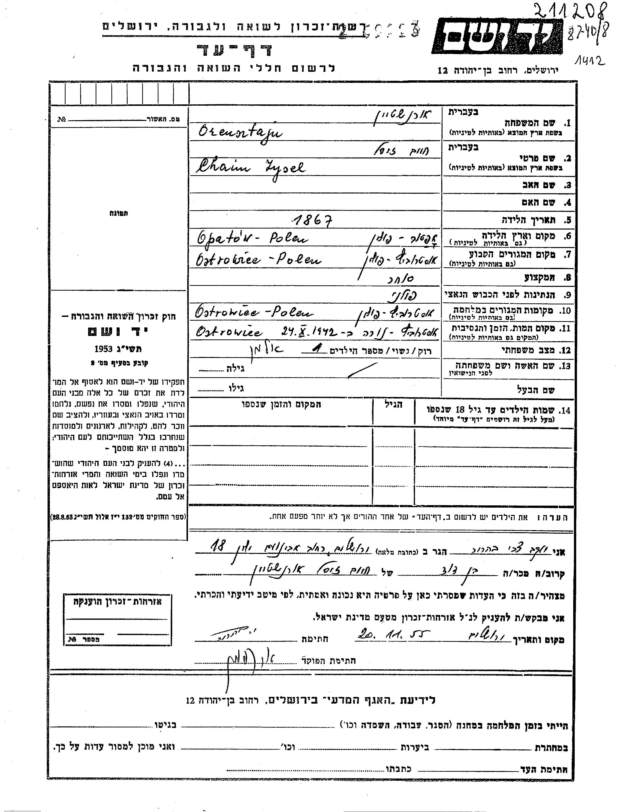 Orensztajn Chaim Zysel Zysl 1867 Ostrowiec, Pologne Feuille de témoignage