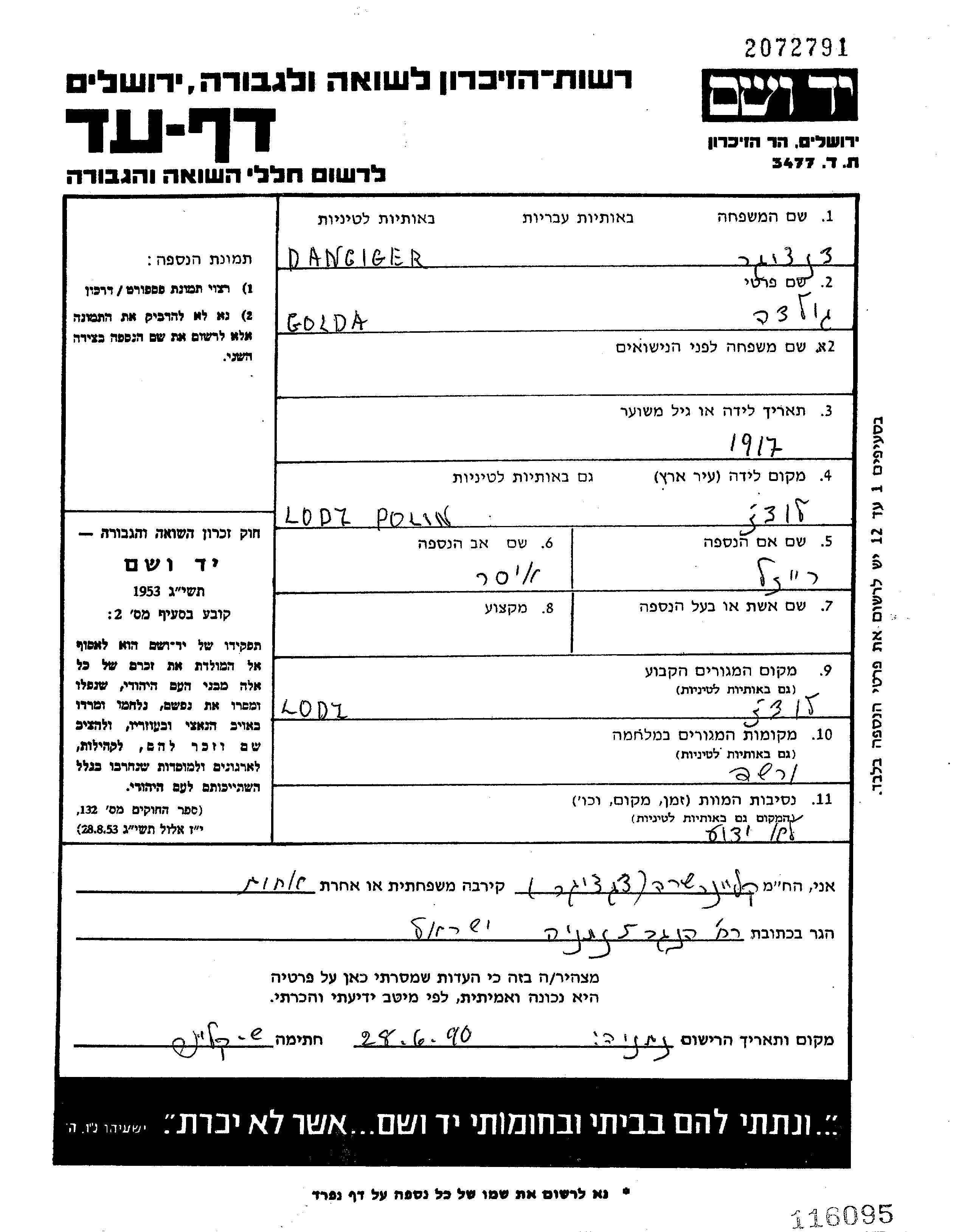 Danciger Golda Lodz, Pologne Feuille de témoignage
