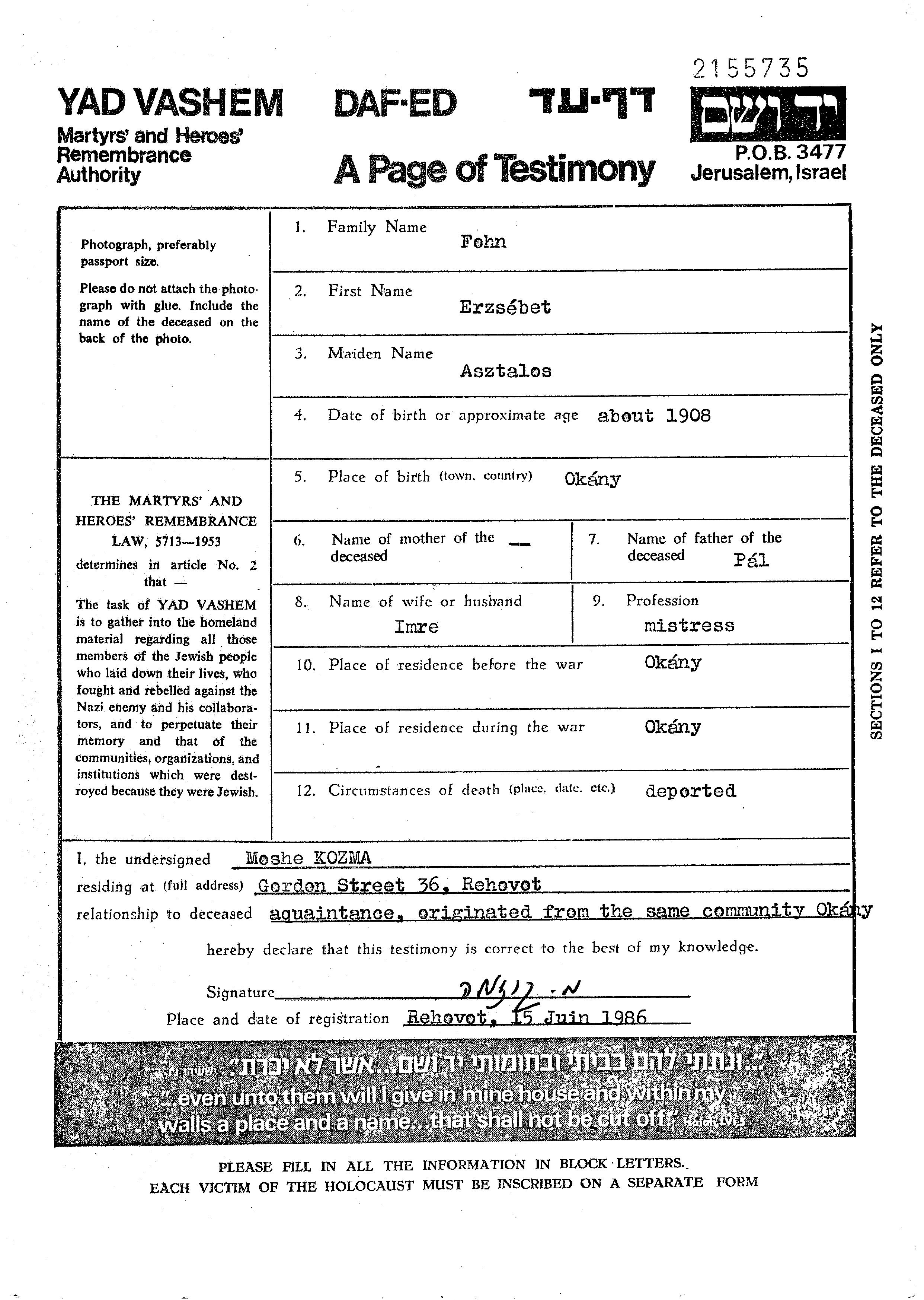 Fohn Pun Erszebet 1908 Okany, Hongrie Feuille de témoignage