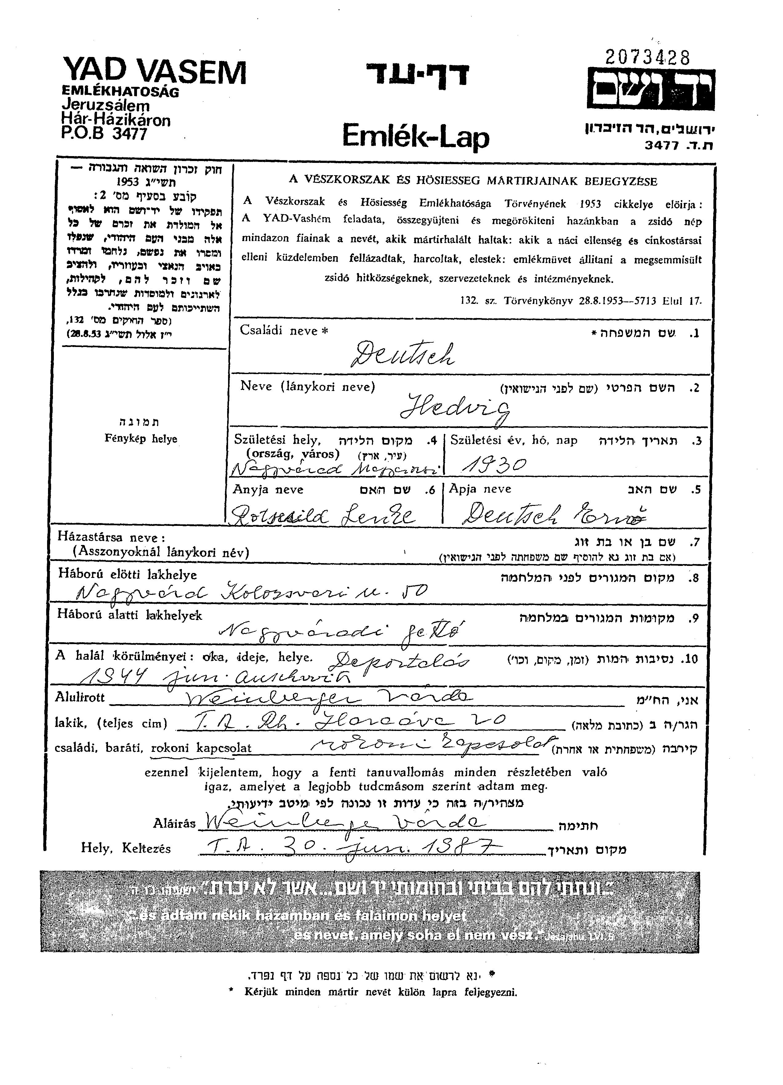 Deutsch Hedvig 1930 Nagyvarad, Roumanie Feuille de témoignage