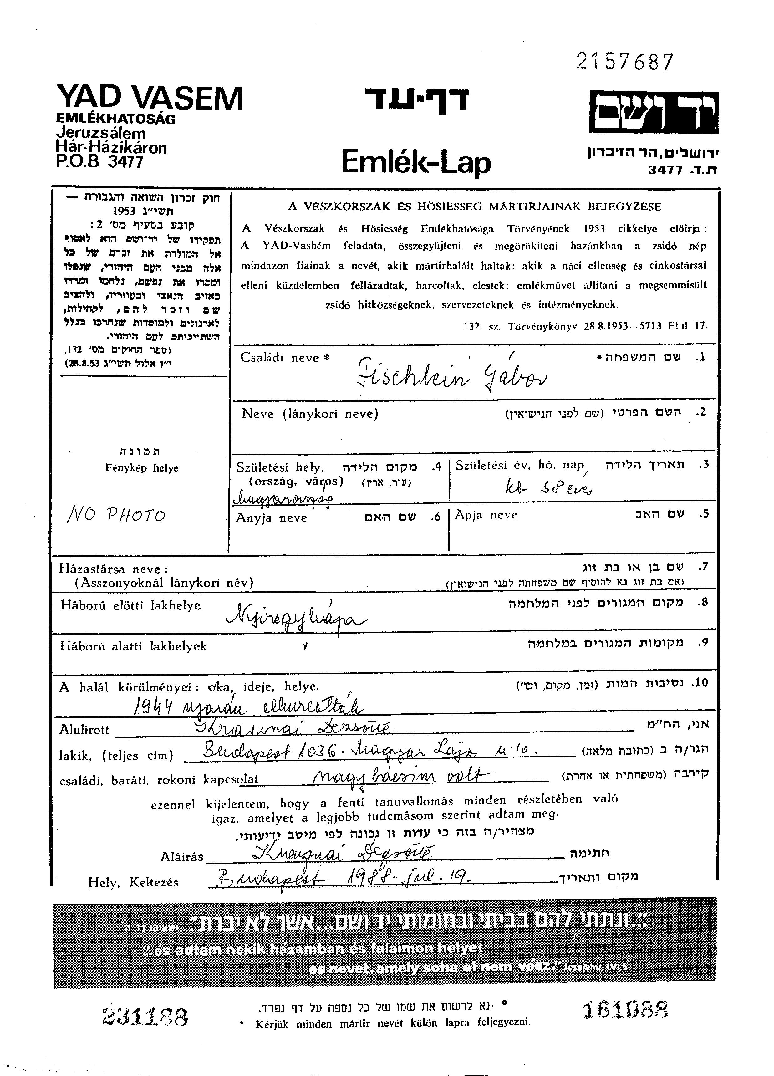 Fischbein Gabor Nyiregyhaza, Hongrie Feuille de témoignage