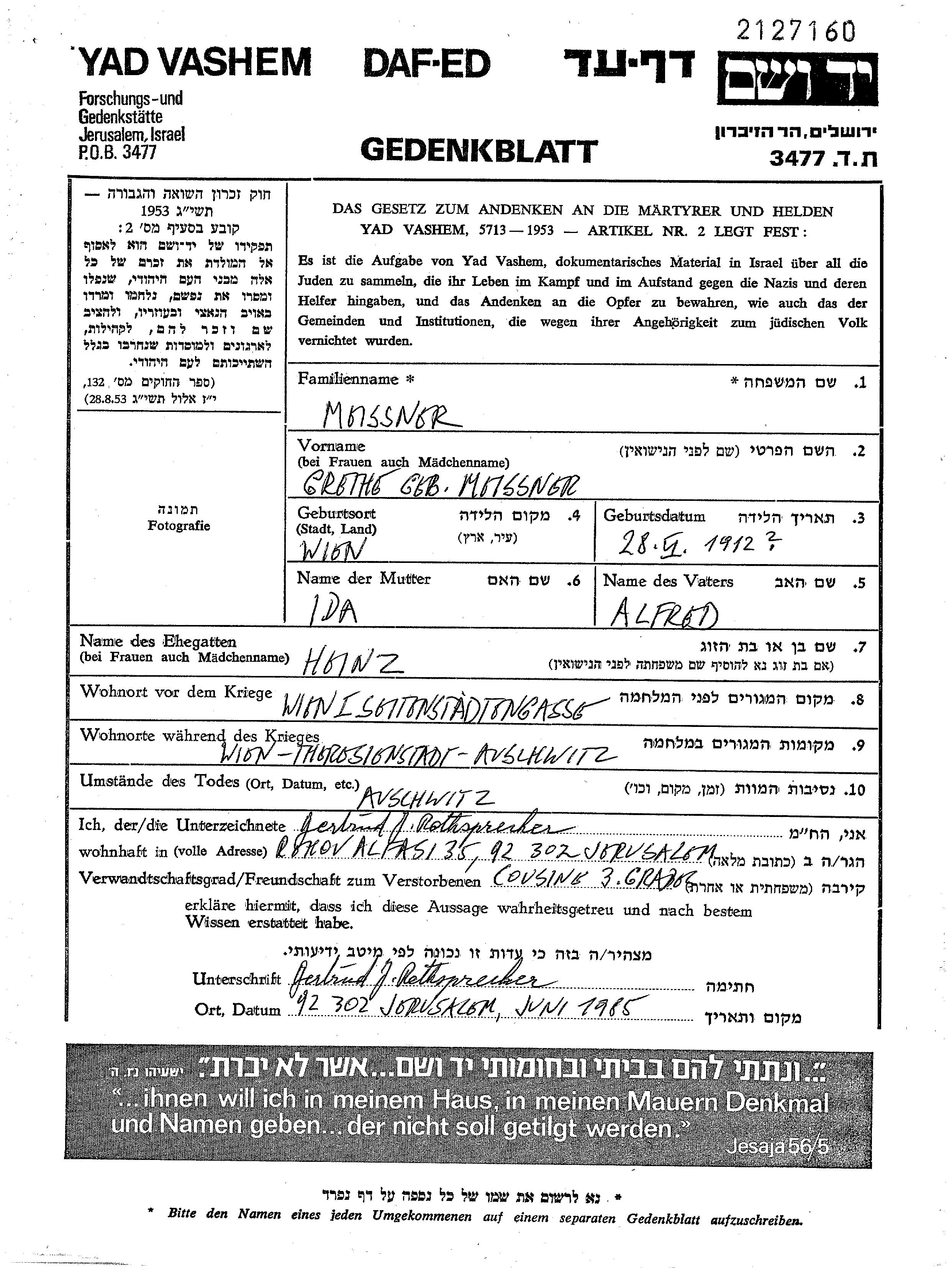 Meissner Grethe 1912 Wien, Autriche Feuille de témoignage