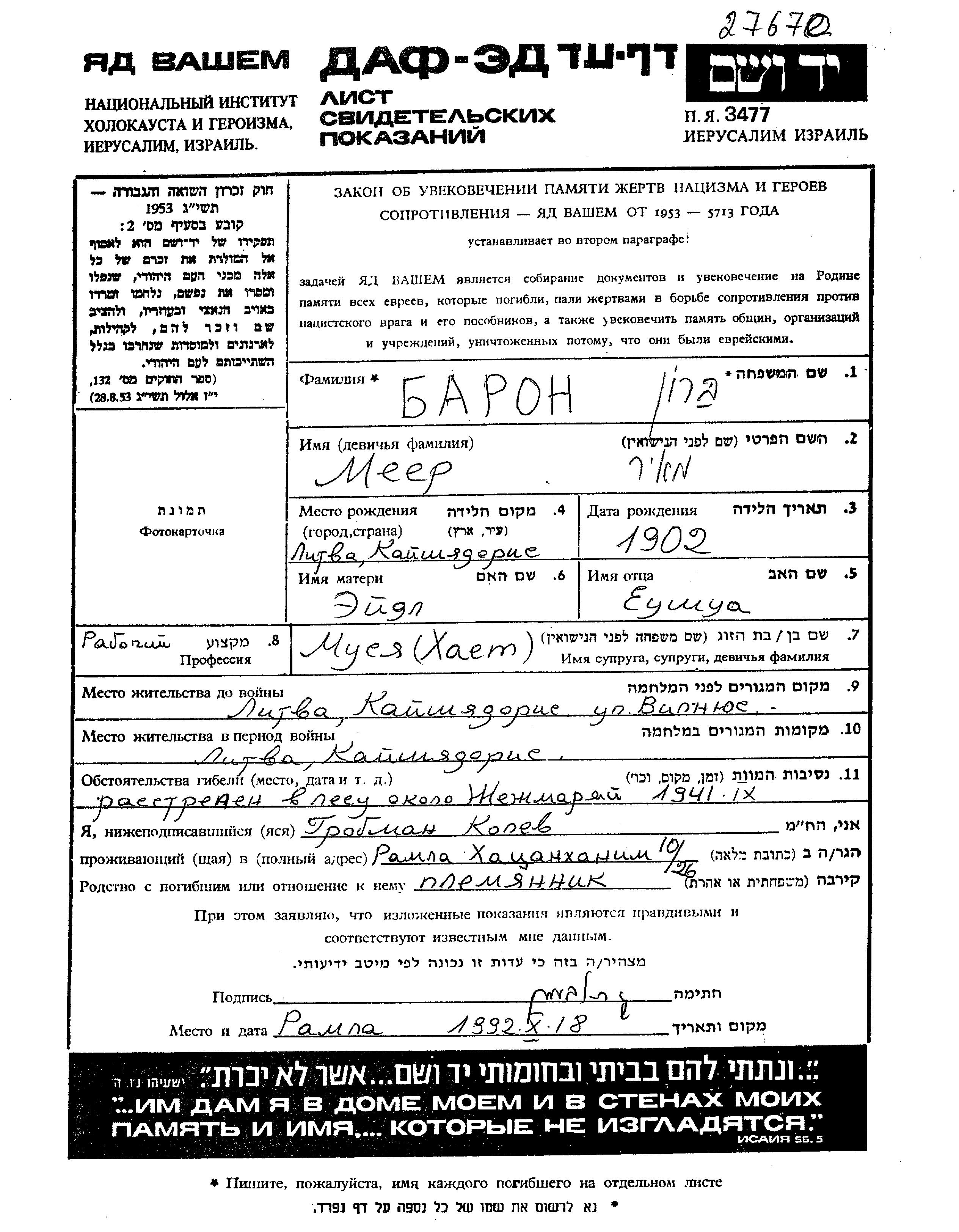 Meer Baron est né à Kaišiadorys, Lituanie en 1902, fils de Yehoshua et de Eidl. Il était Ouvrier/e et Mariée à Musia née Khayet. Avant la seconde guerre mondiale il vivait à Kaišiadorys, Lituanie. Au cours de la guerre, il était à Kaišiadorys, Lituanie.