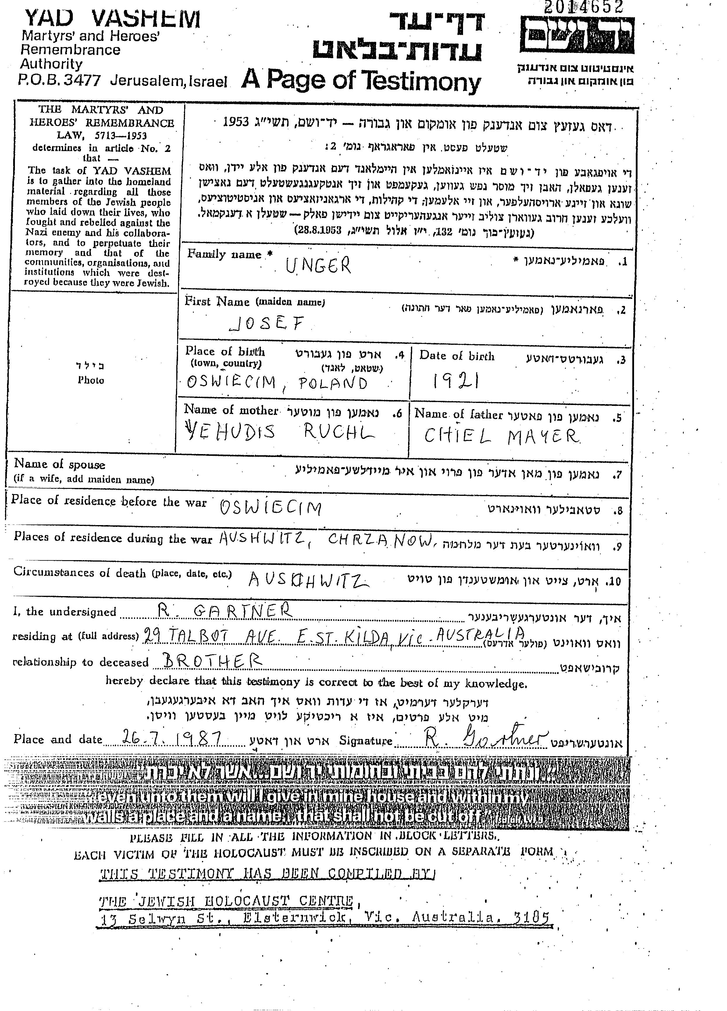Unger Josef 1921 Oświęcim, Pologne Feuille de témoignage