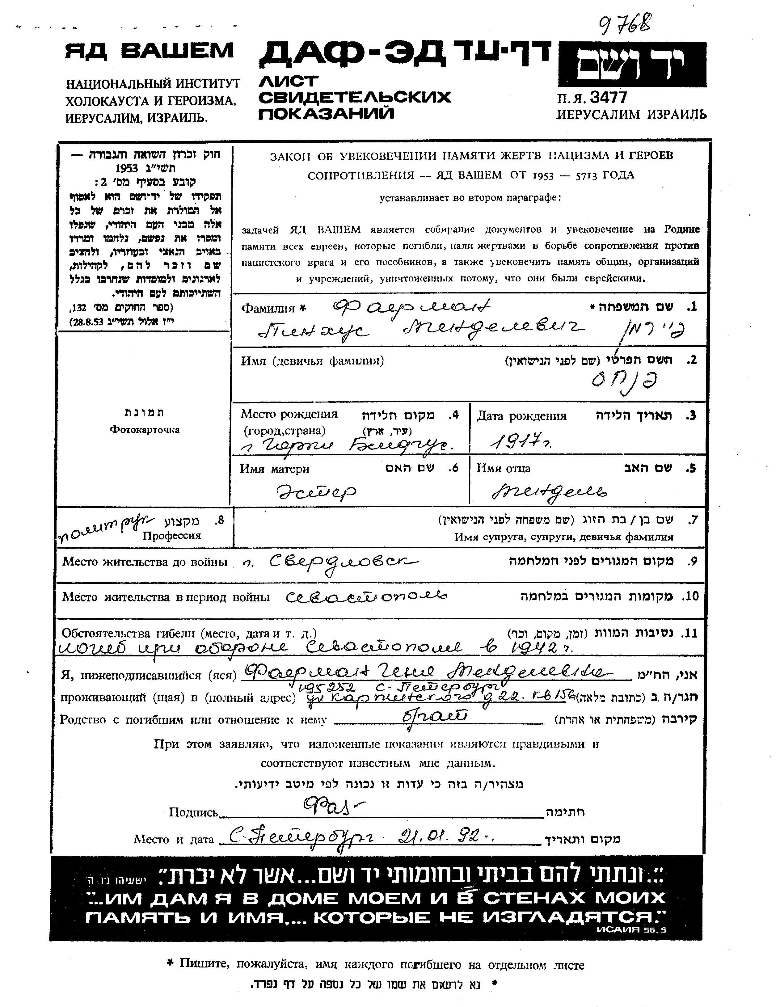 Pinkhus Fayerman est né à Gorki, Bélorussie (URSS) en 1917, fils de Mendel et de Ester. Il était Officier. Avant la seconde guerre mondiale il vivait à Sverdlovsk, Russie (URSS). Au cours de la guerre, il était à the Soviet armed forces. Pinkhus a été tué en tant que militaire pendant la Seconde Guerre mondiale. Lieu de la mort: Sevastopol, Russie (URSS) en 1942.
