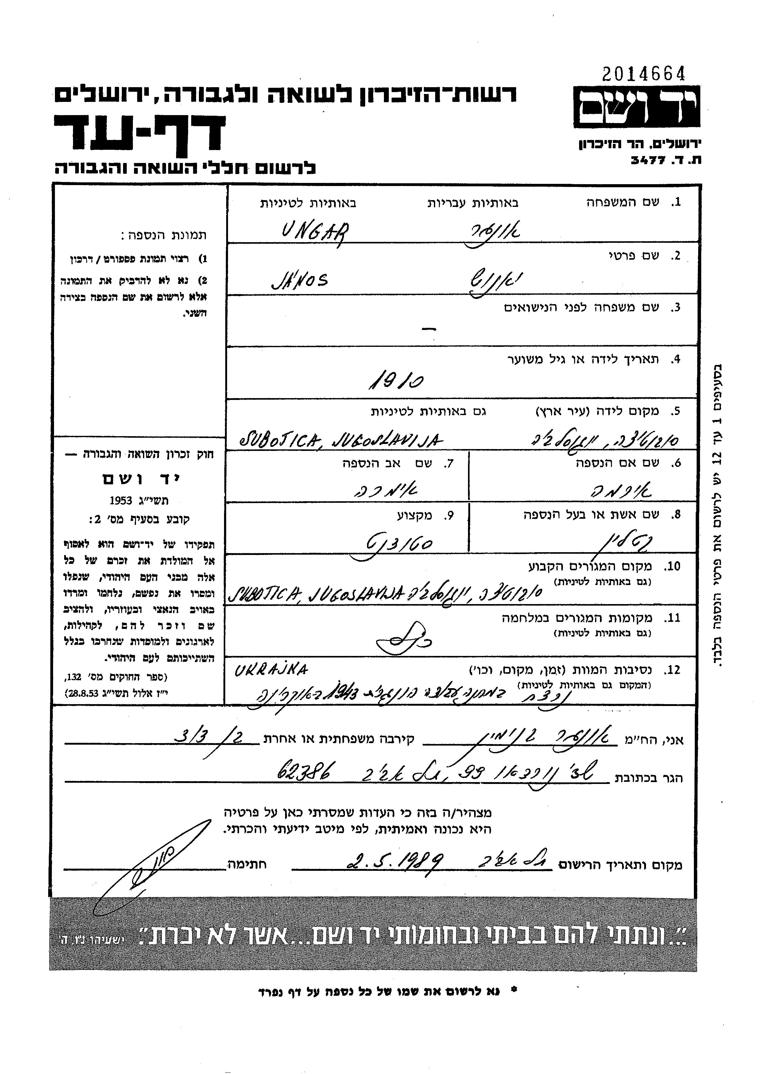 Ungar Janos 1910 Subotica, Yugoslavie Feuille de témoignage
