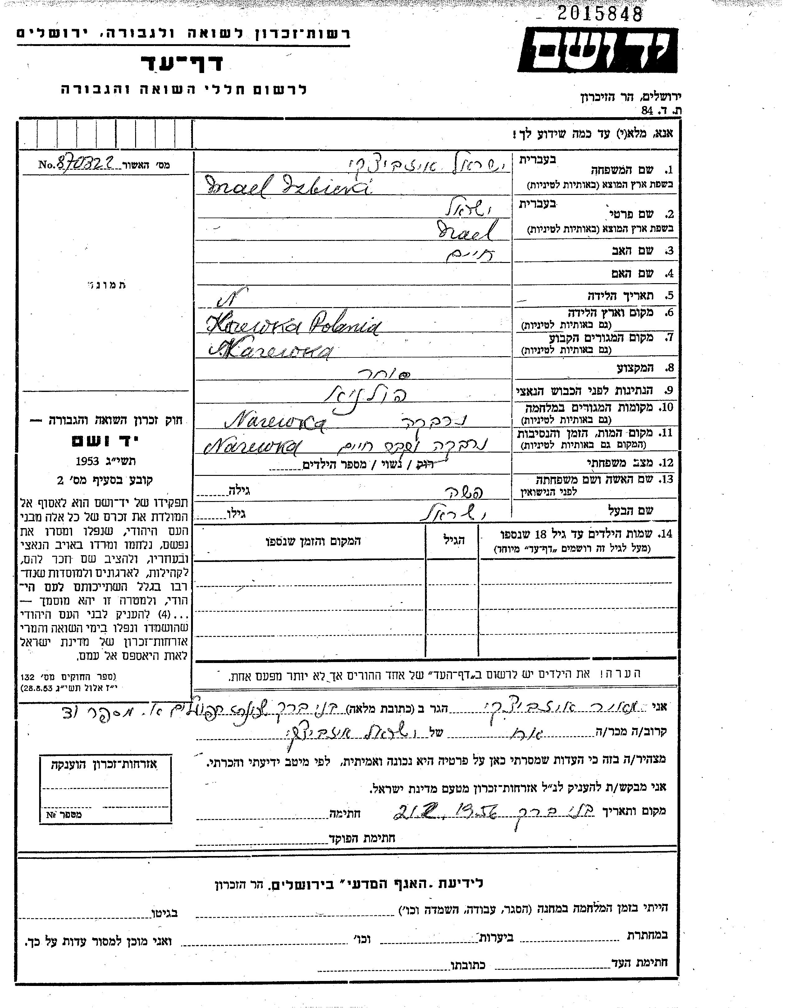 Izbicki Israel Narewka Mala, Pologne Feuille de témoignage