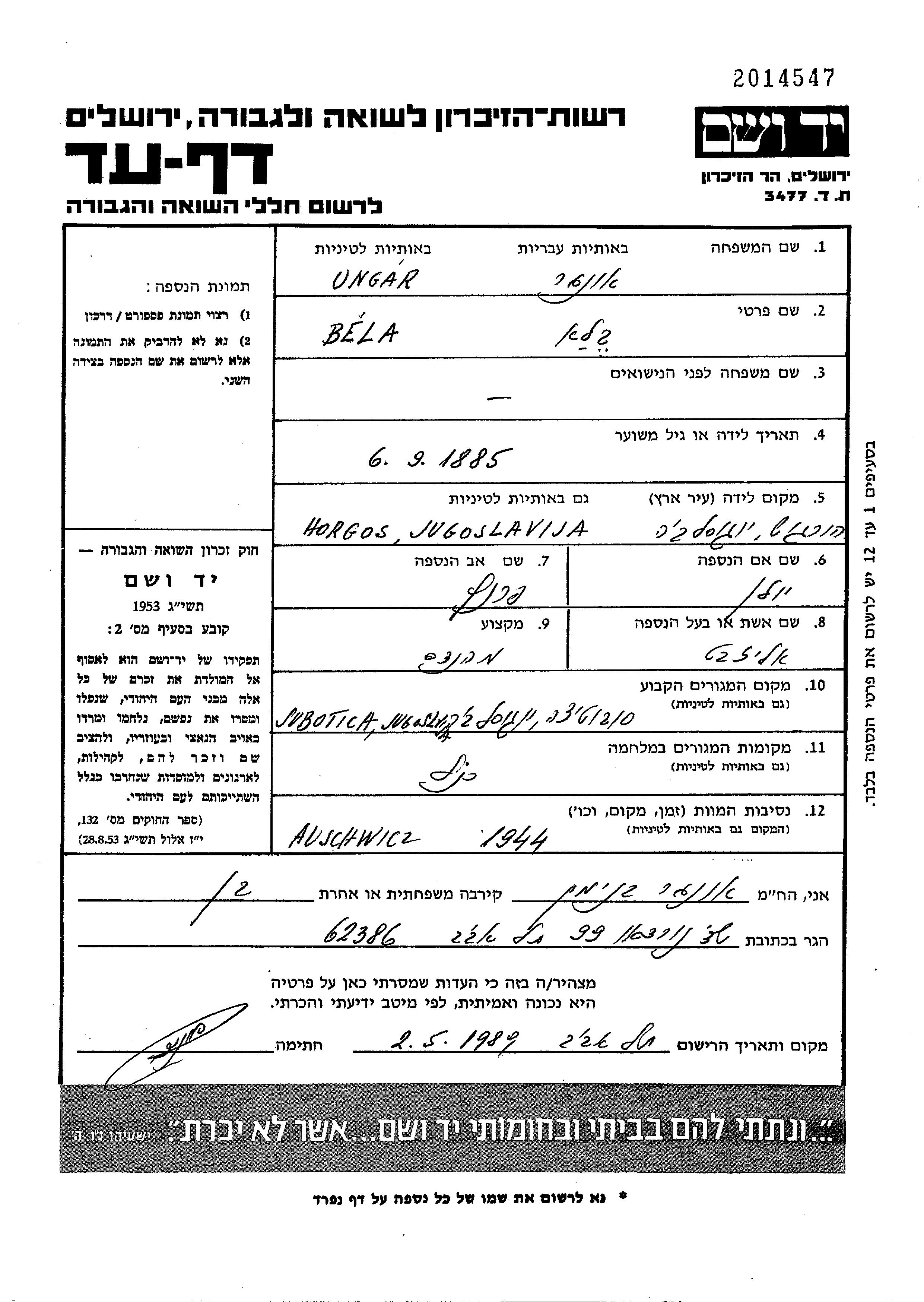 Ungar Bela 1885 Subotica, Yugoslavie Feuille de témoignage