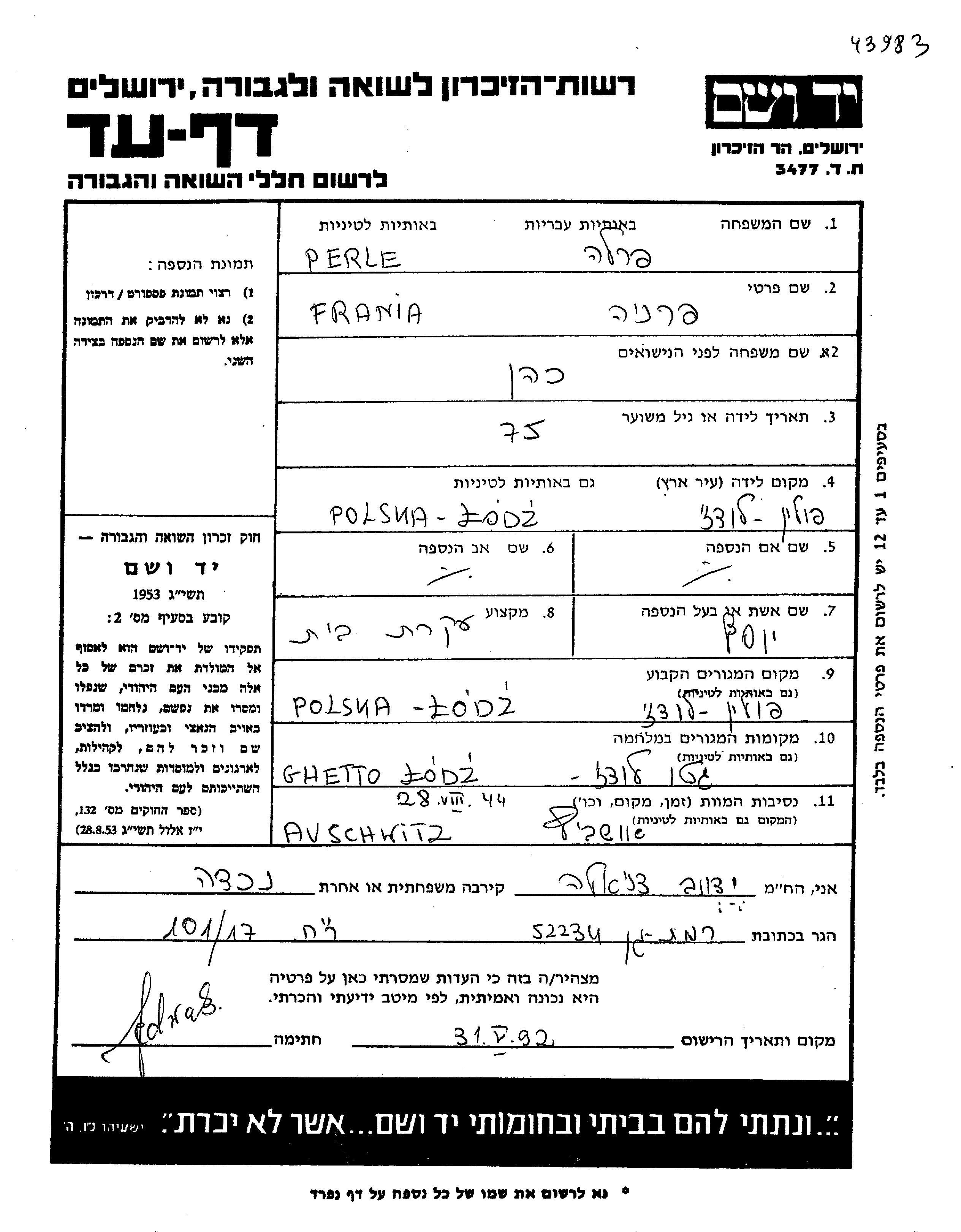 Perle Frania 1869 Lodz, Pologne Feuille de témoignage