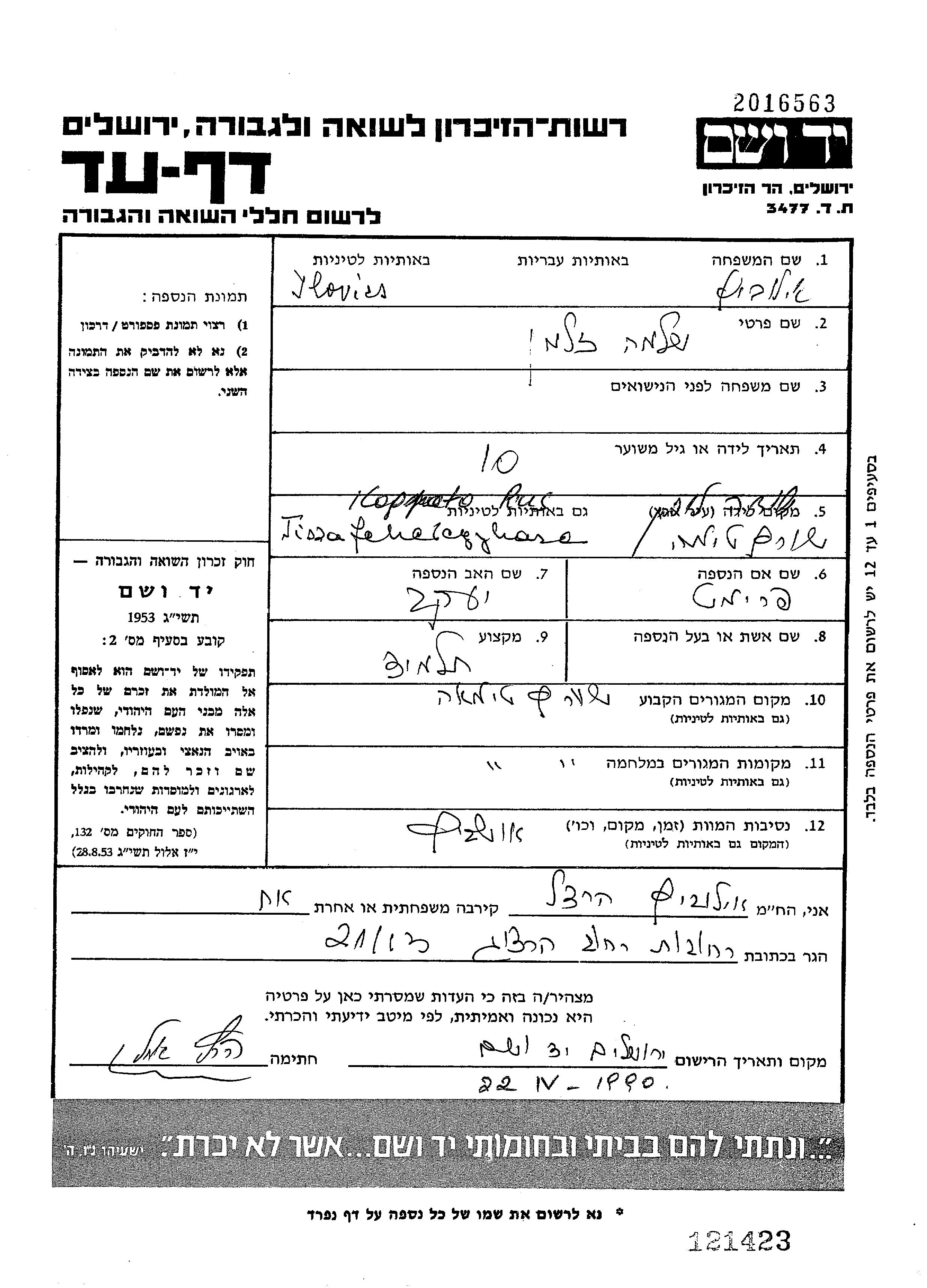 Yad Vashem - Pages of Testimony Names Memorial Collection