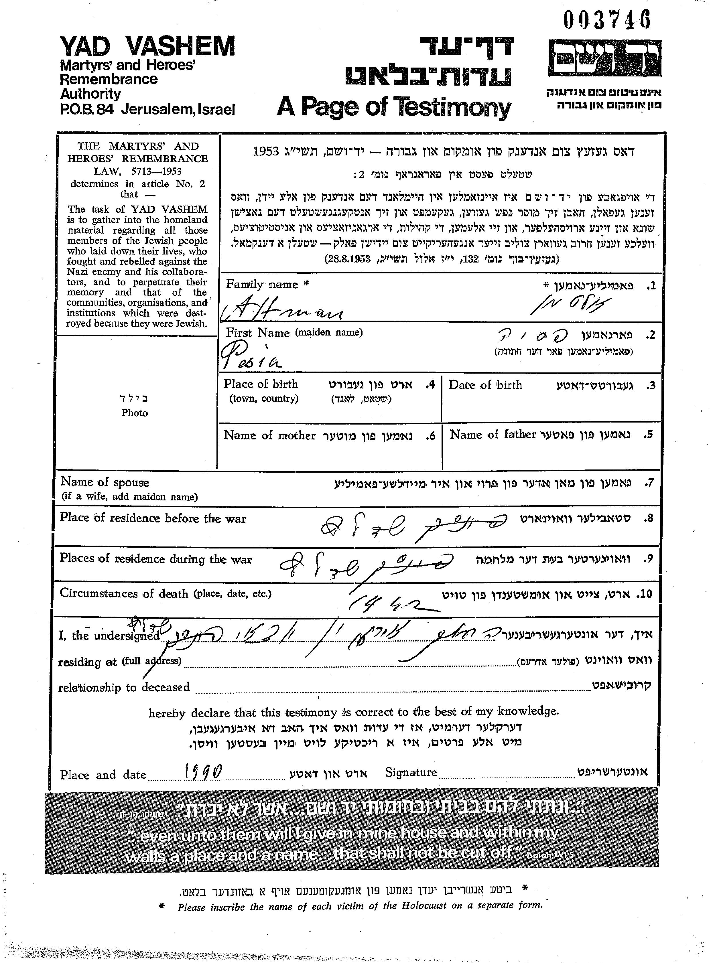 Yad Vashem - Pages of Testimony Names Memorial Collection