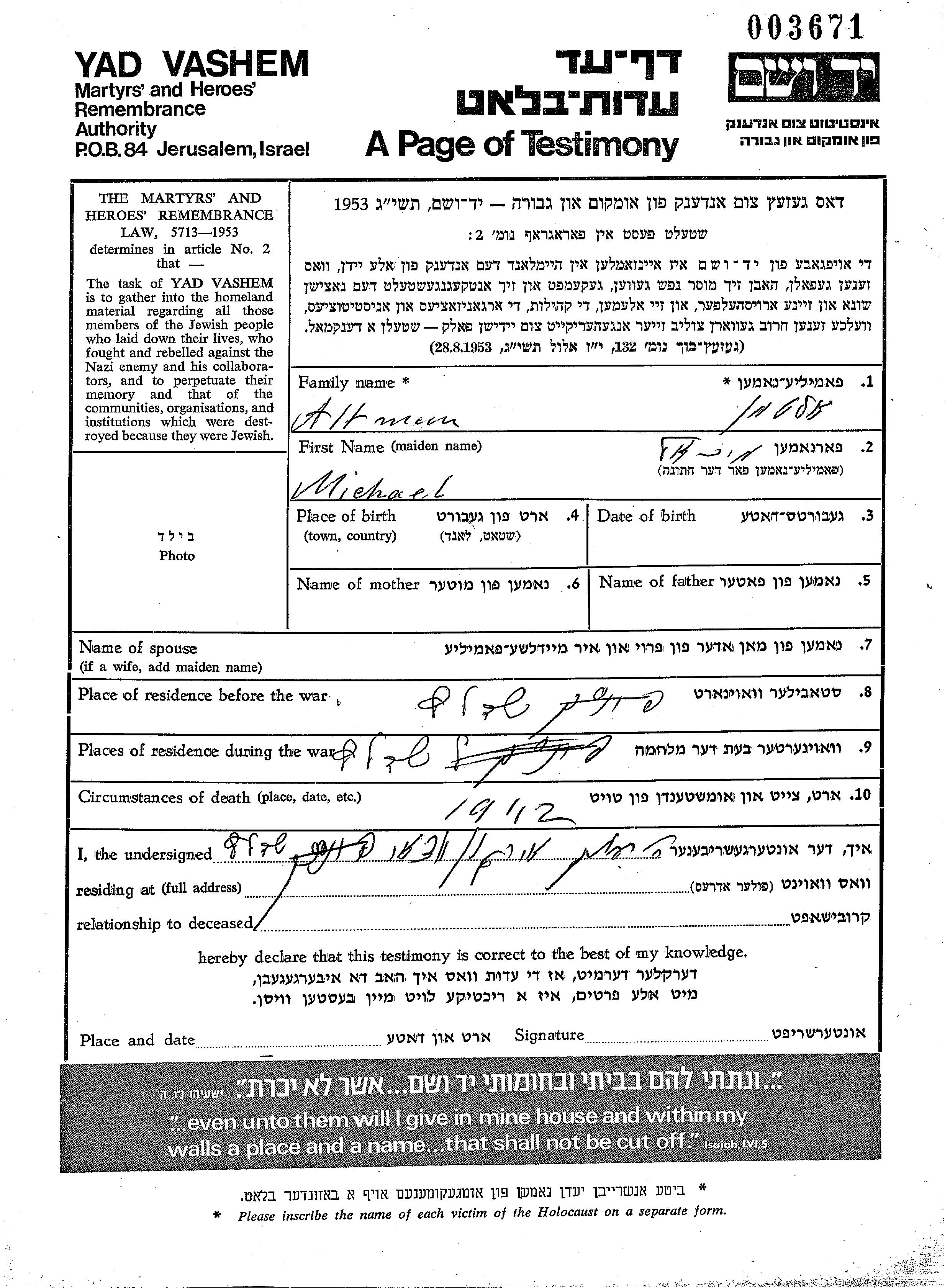 Yad Vashem - Pages of Testimony Names Memorial Collection