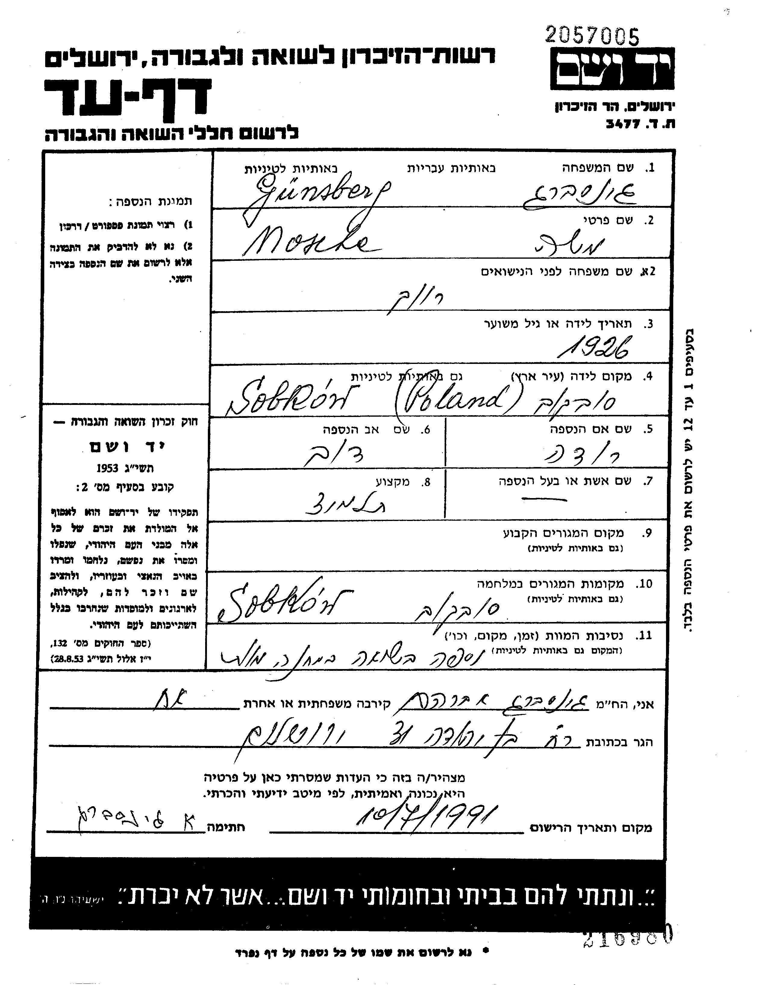 Mosche Guensberg est né à Sobkow, Pologne en 1926, fils de Dov Berek et de Roda née Beckermann. Il était Élève et Enfant. Avant la seconde guerre mondiale il vivait à Sobkow, Pologne. Au cours de la guerre, il était à Sobkow, Pologne.