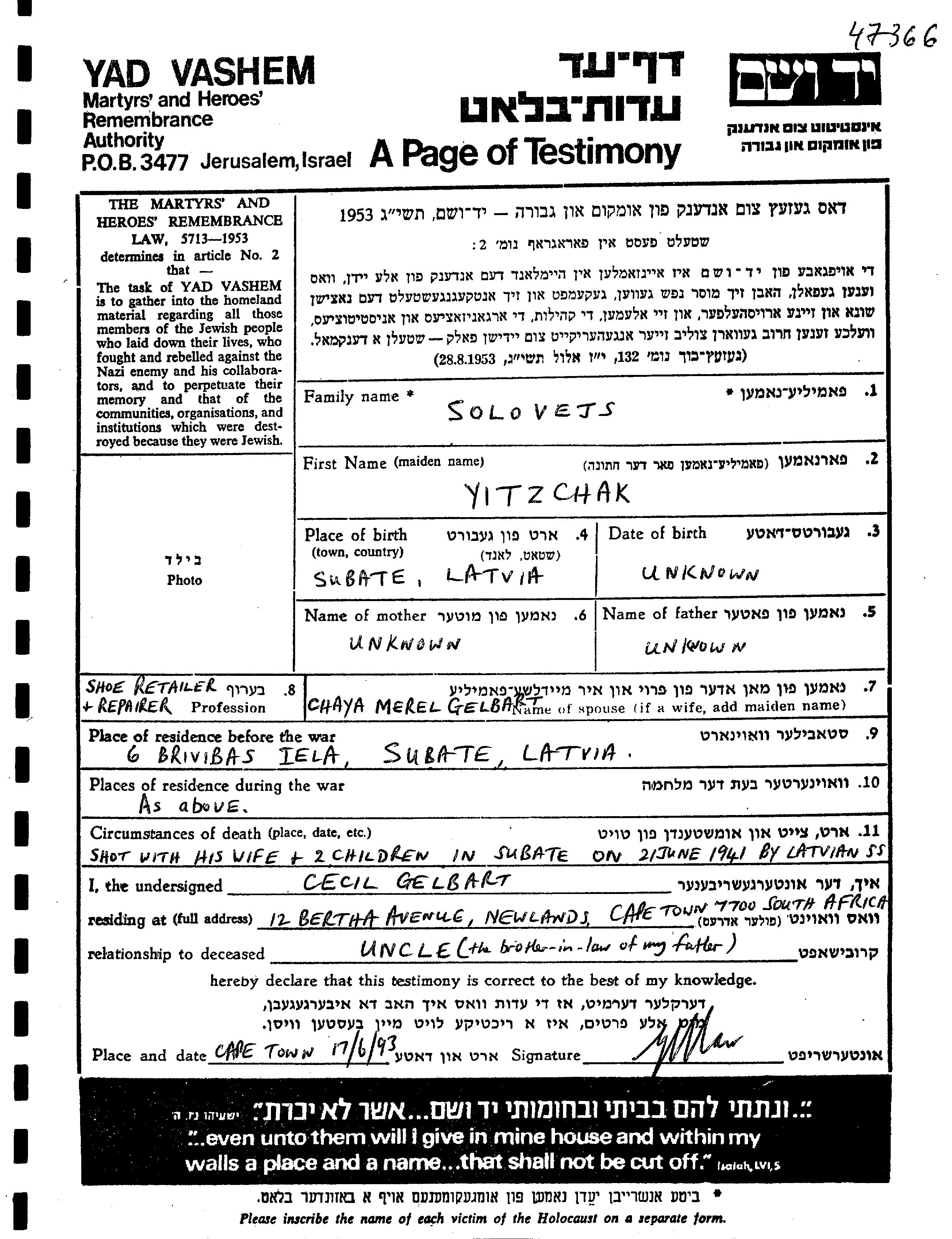Solovejs Yitzchak Subate, Lettonie Feuille de témoignage