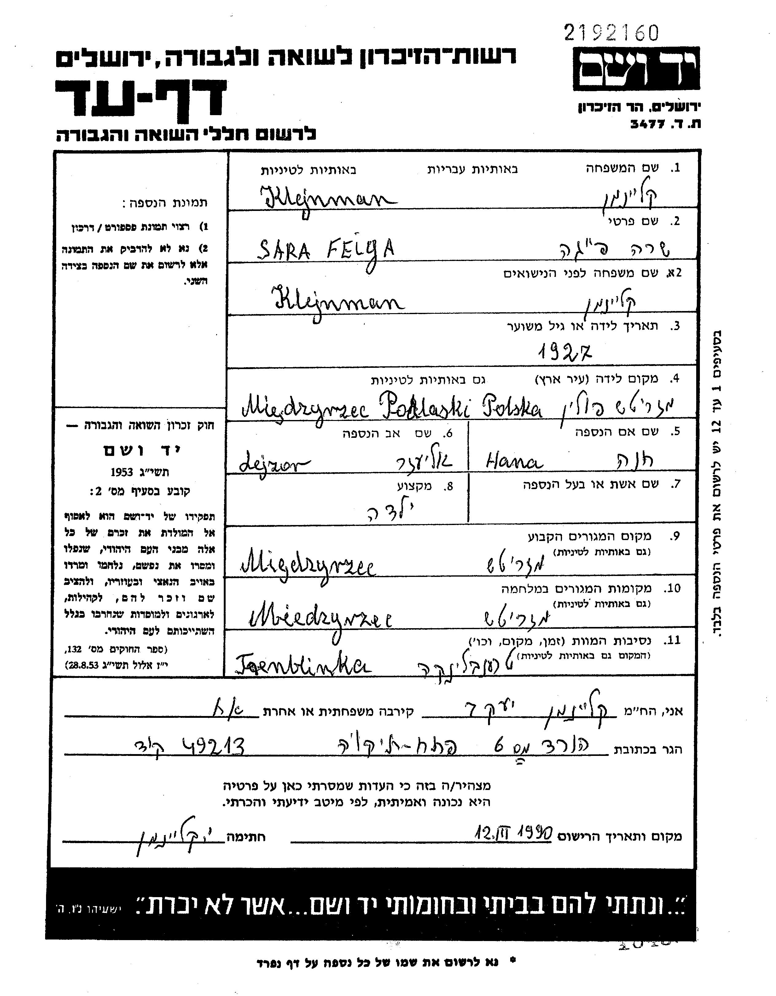 Klejnman Sara Feiga 1927 Miedzyrzec Podlaski, Pologne Feuille de témoignage