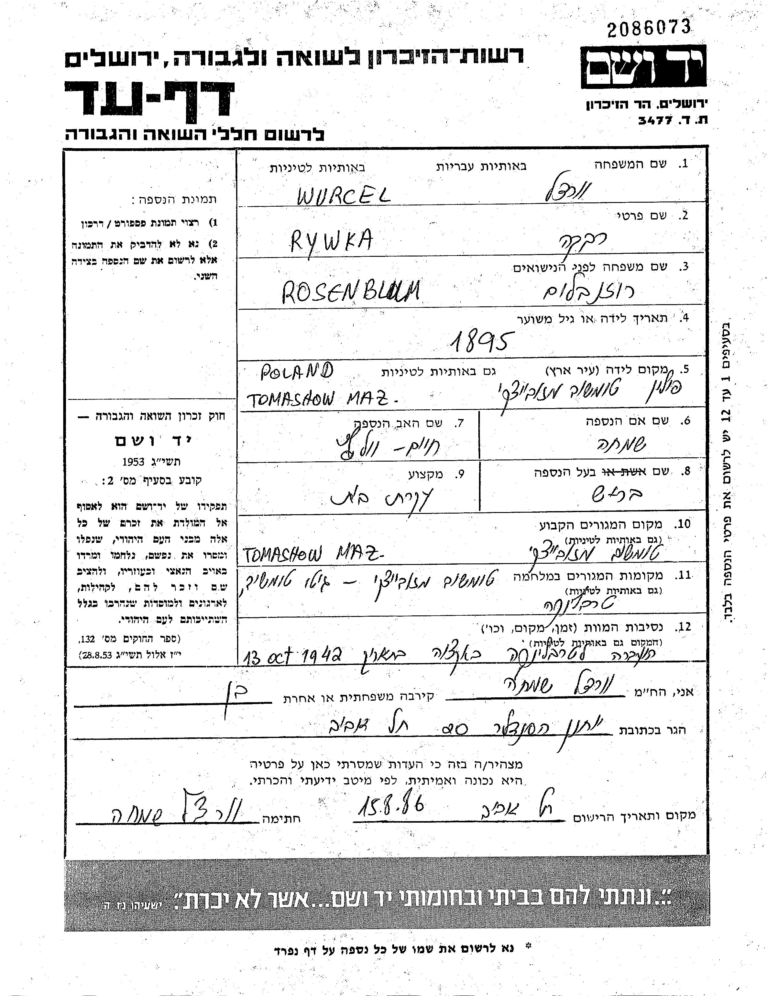 Wurcel Rywka 1895 Tomaszow Mazowieckie, Pologne Feuille de témoignage