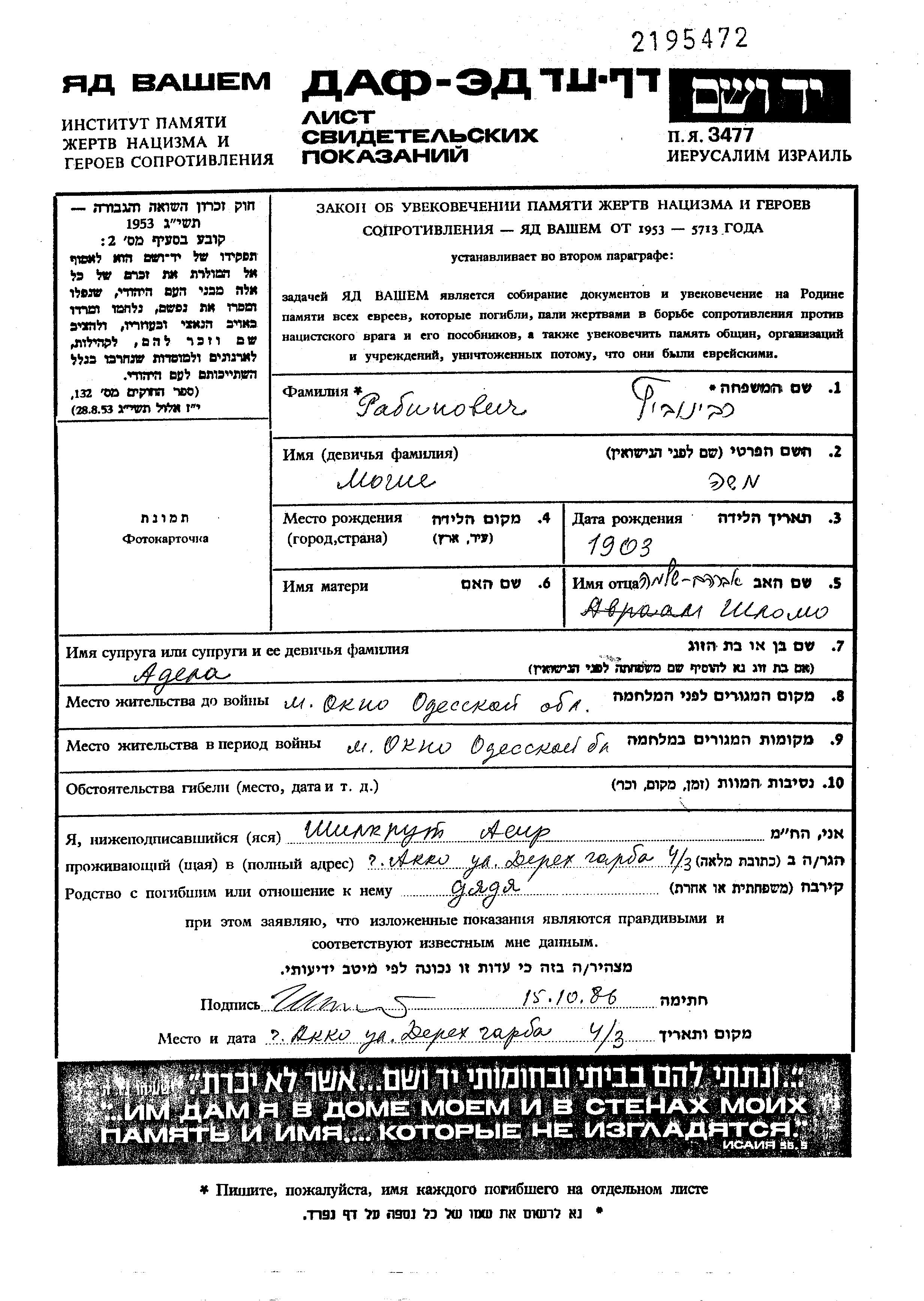 Moshe Rabinovich est né en 1903, fils de Shlomo. Il était Mariée à Adela. Avant la seconde guerre mondiale il vivait à Okno, Pologne. Au cours de la guerre, il était à Okno, Pologne.