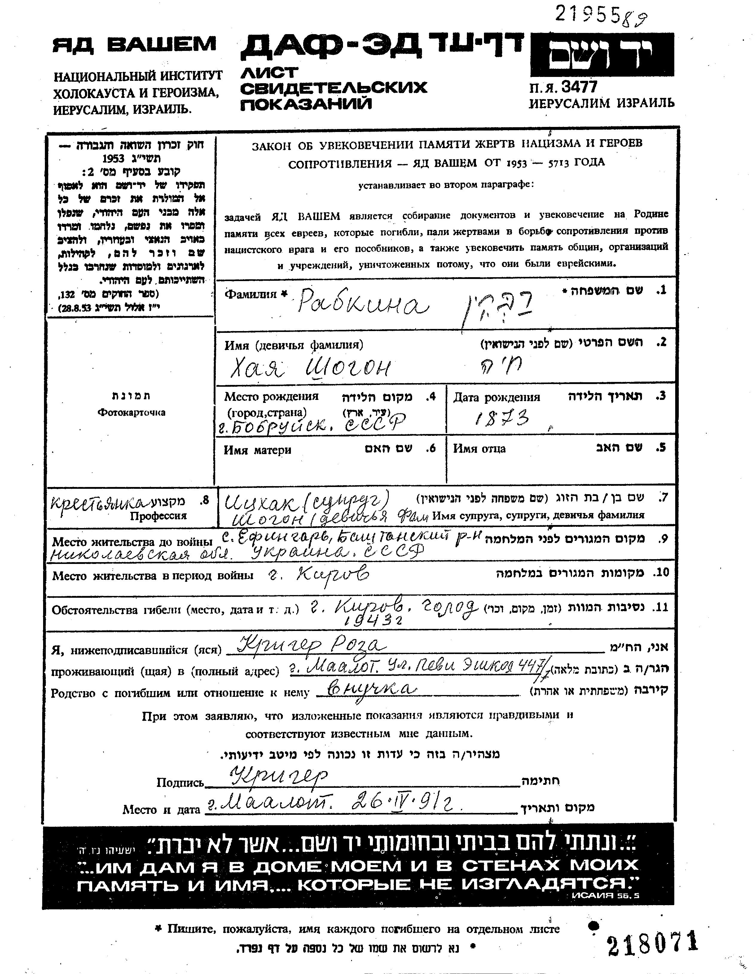 Khaia Rabkin Ravkin née Shogon est née à Bobruysk, Bélorussie (URSS) en 1873. Elle était Mariée à Yitzkhak. Avant la seconde guerre mondiale elle vivait à Efingar, Ukraine (URSS). Pendant la guerre, elle était à Kirov, Russie (URSS).