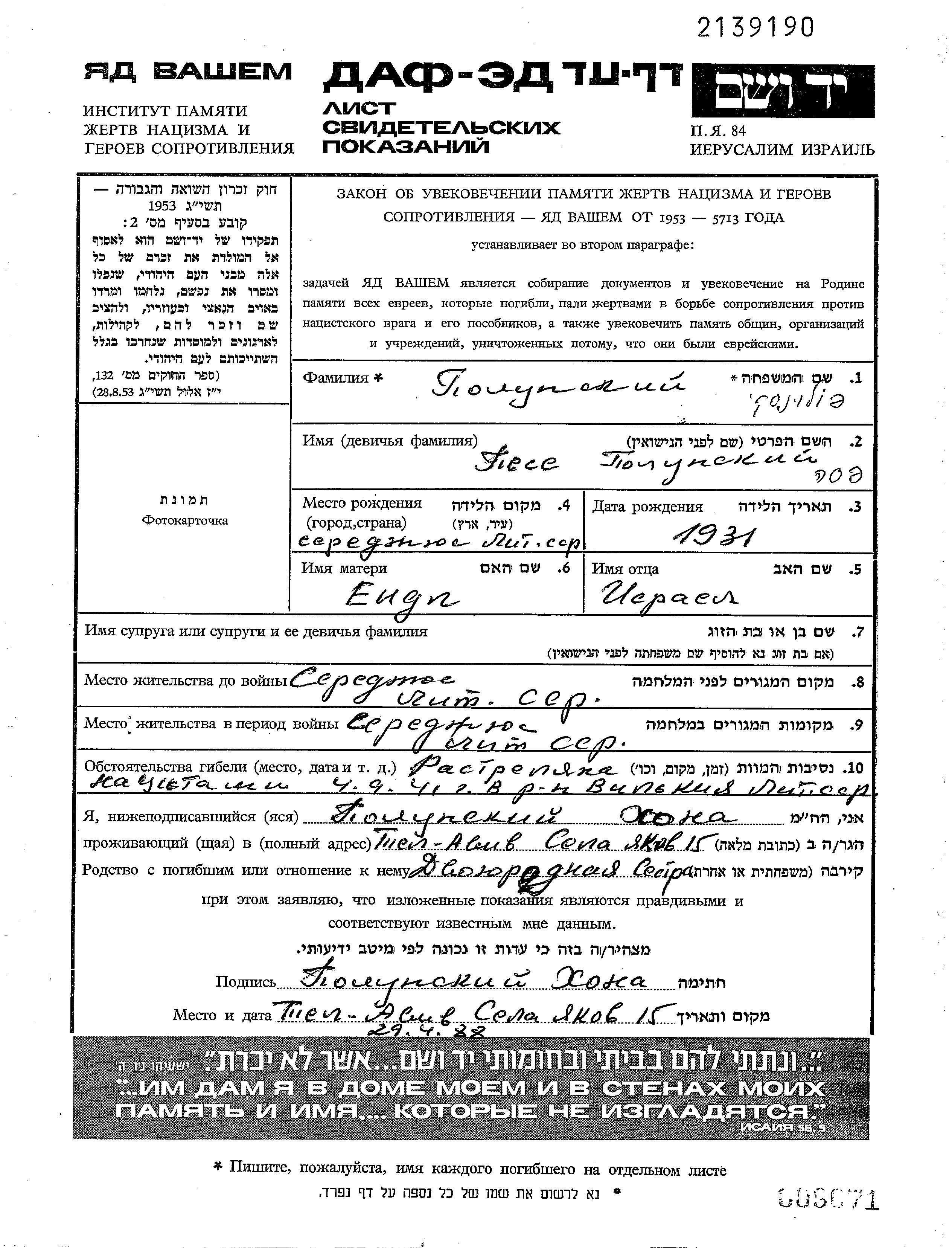 Polonski Pese Seredzius, Lituanie Feuille de témoignage