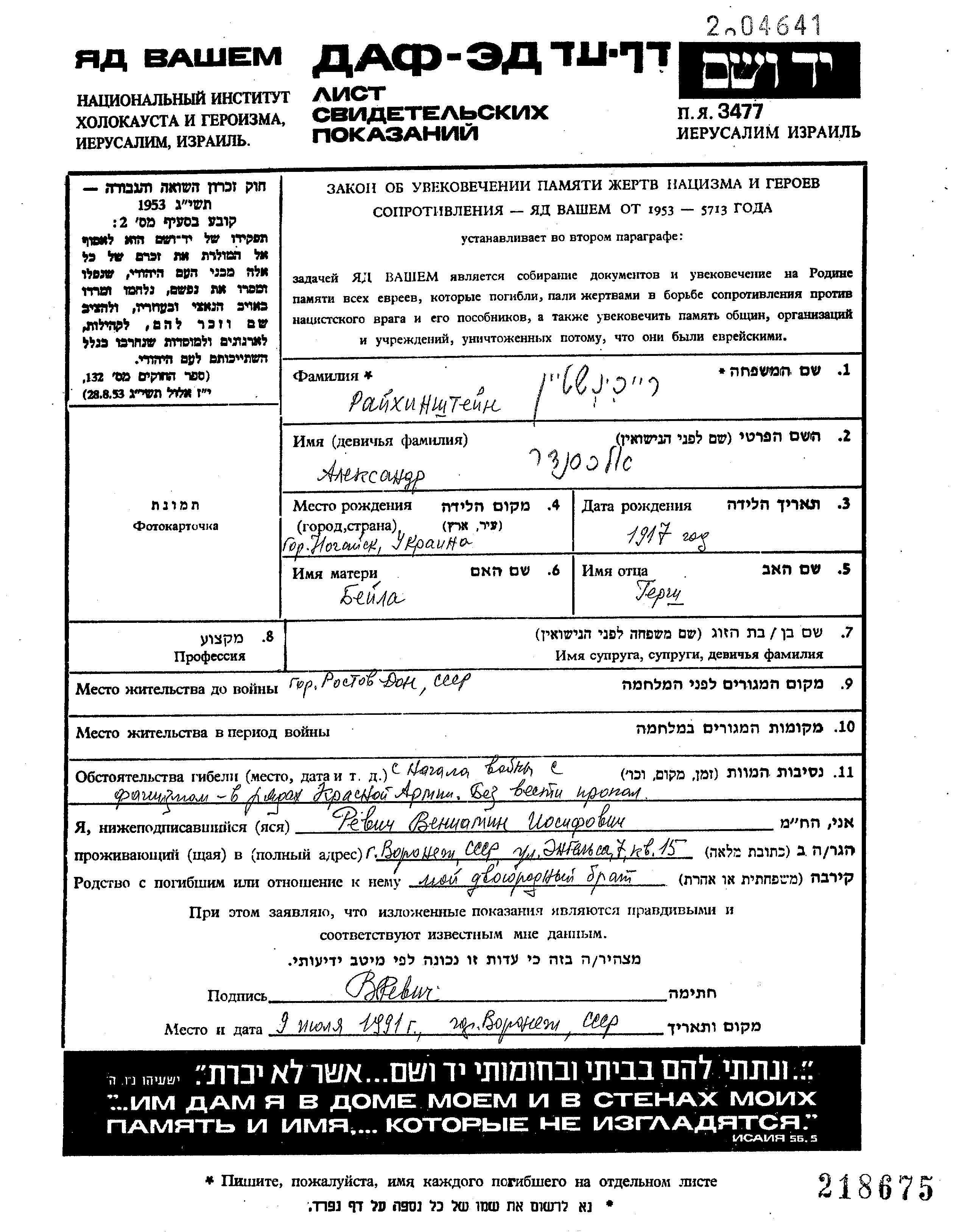 Raikhinstein Aleksandr 1917 Rostov, Russie (URSS) Feuille de témoignage