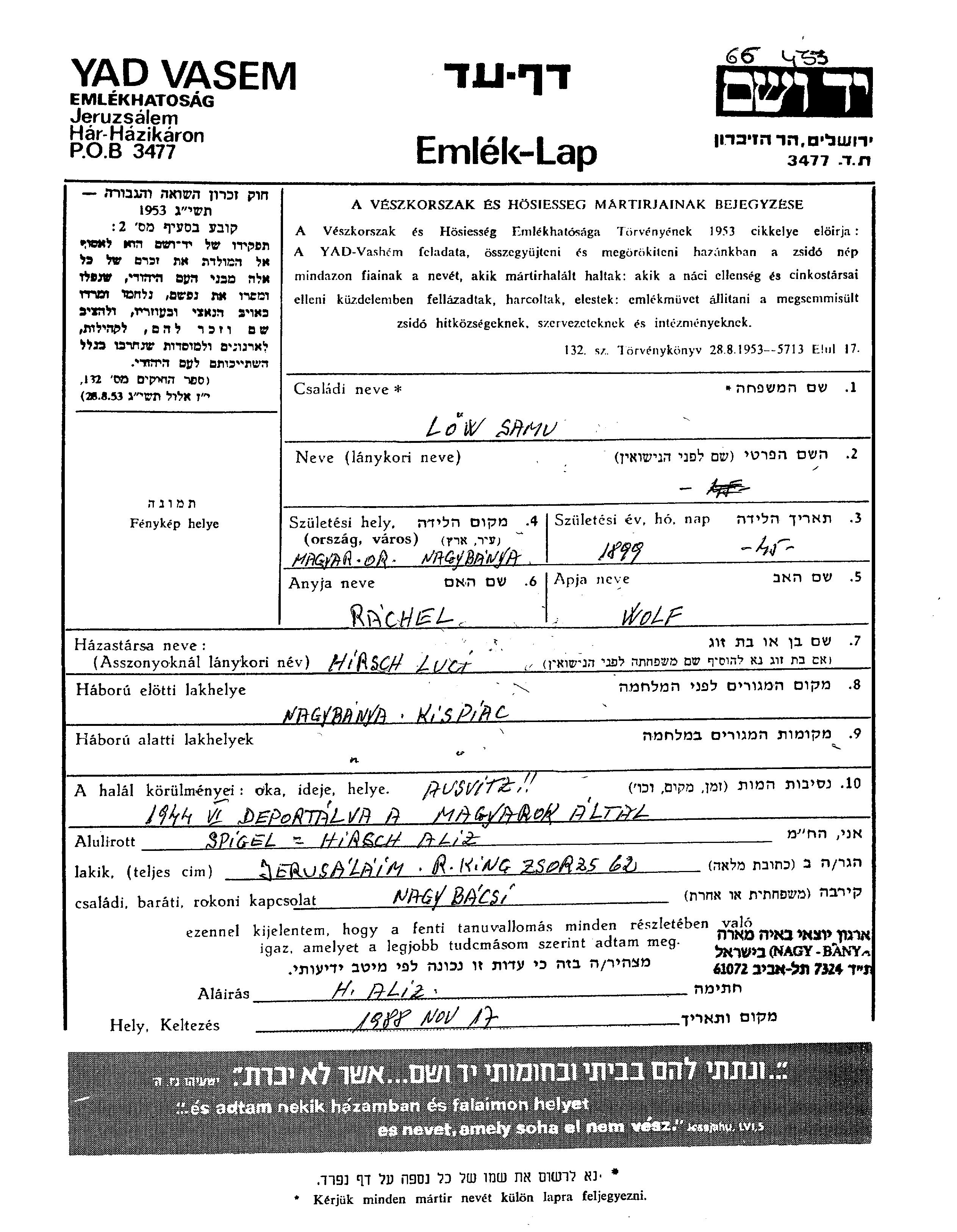 Samu Low est né à Nagybánya, Roumanie en 1899, fils de Wolf et de Rachel. Il était Mariée à Luci. Avant la seconde guerre mondiale il vivait à Nagybánya, Roumanie. Au cours de la guerre, il était à Nagybánya, Roumanie.