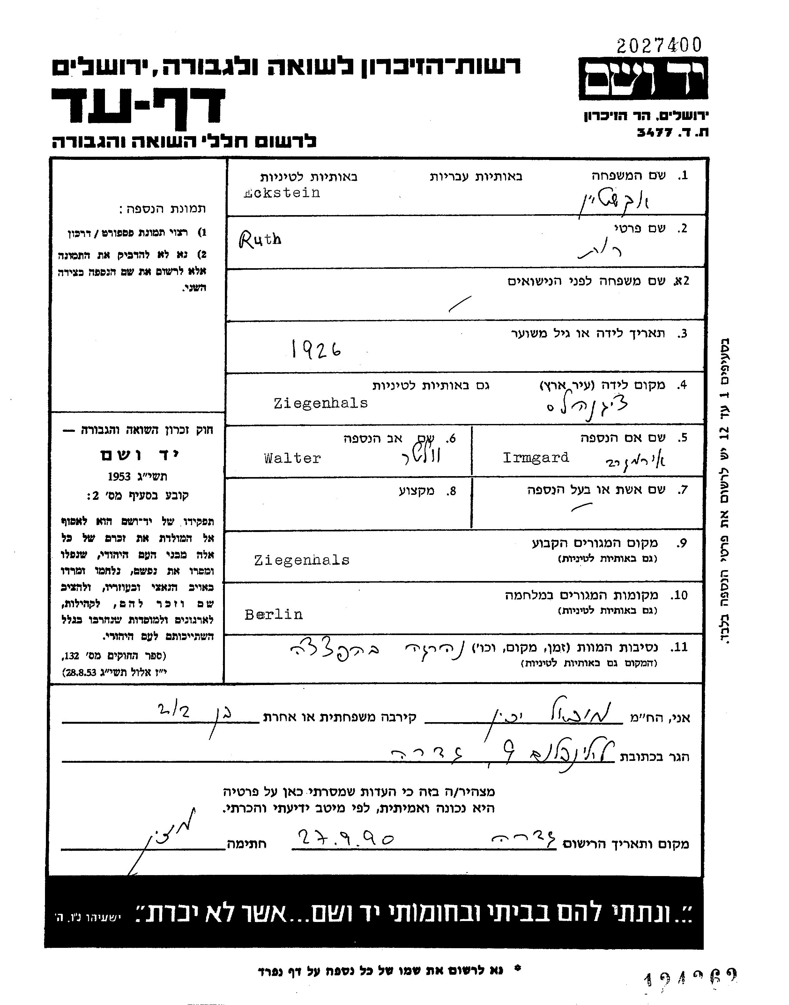 Eckstein Ruth 1926 Ziegenhals, Allemagne Feuille de témoignage