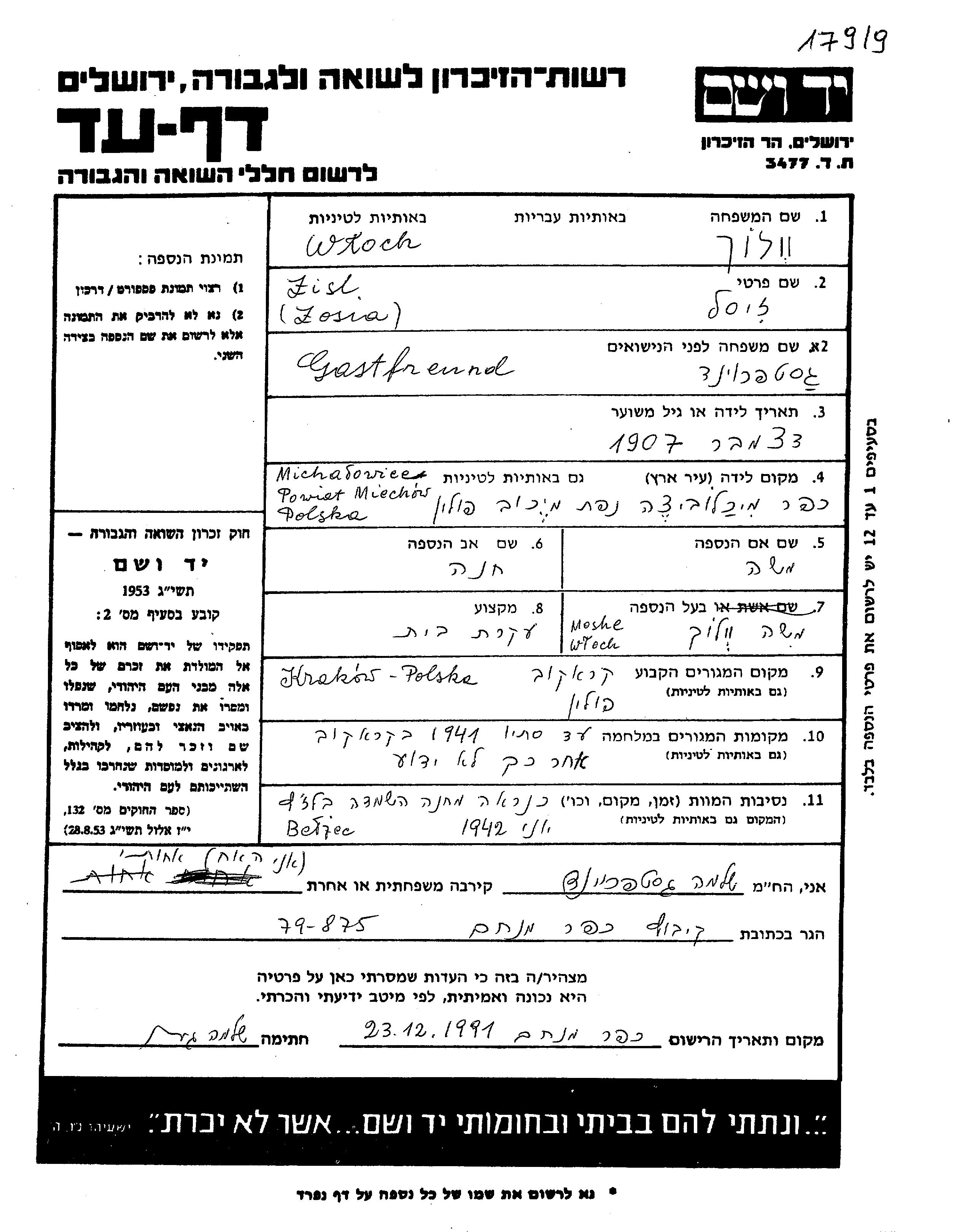 Zisl Zosia Zysl Wloch est née à Michalowice, Pologne en 1907, fille de Moshe et de Hana. Elle était Mariée à Moshe née Gastfreund. Avant la seconde guerre mondiale elle vivait à Krakow, Pologne. Pendant la guerre, elle était à Krakow, Pologne.