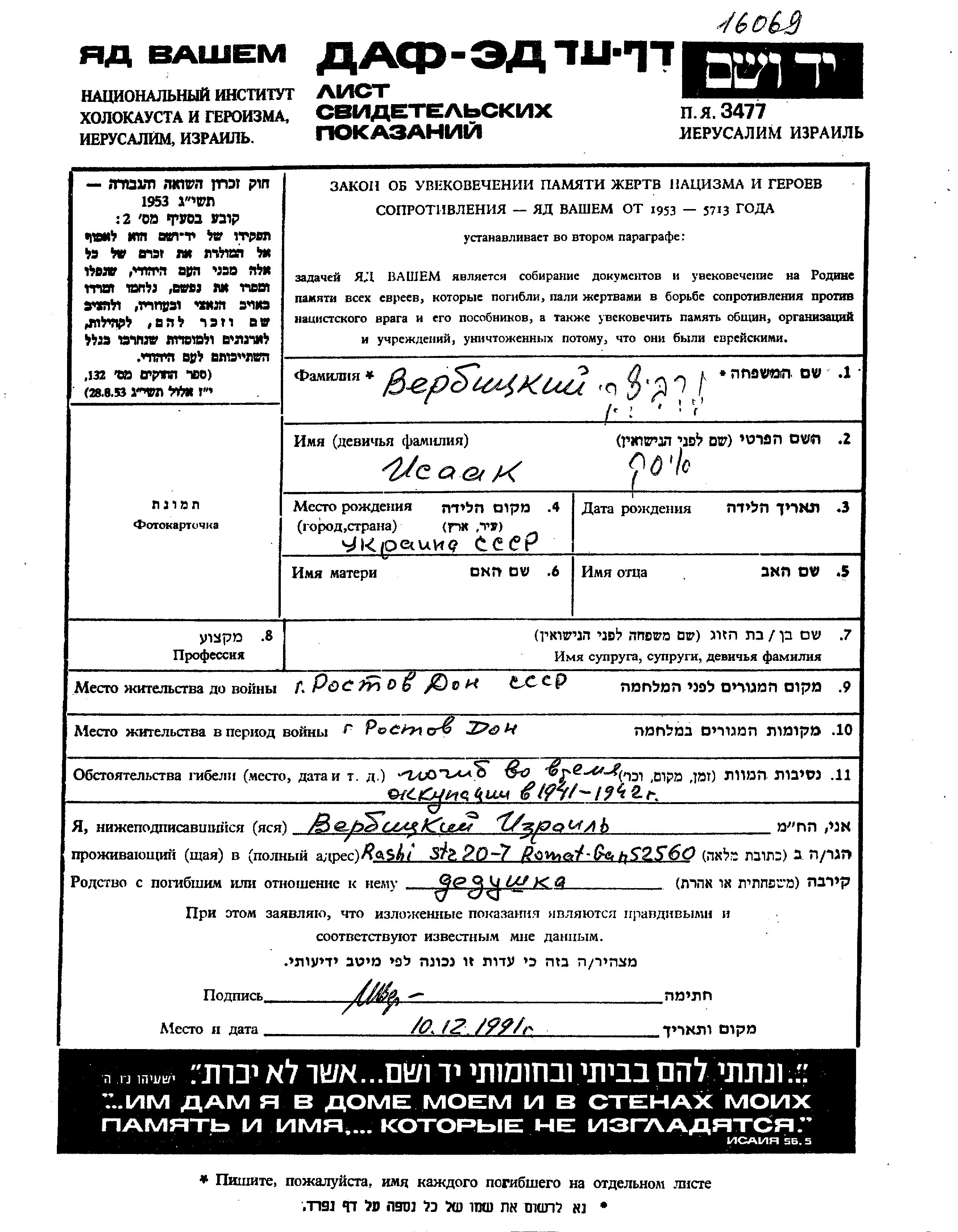 Verbitzki Isaak Rostov, Russie (URSS) Feuille de témoignage