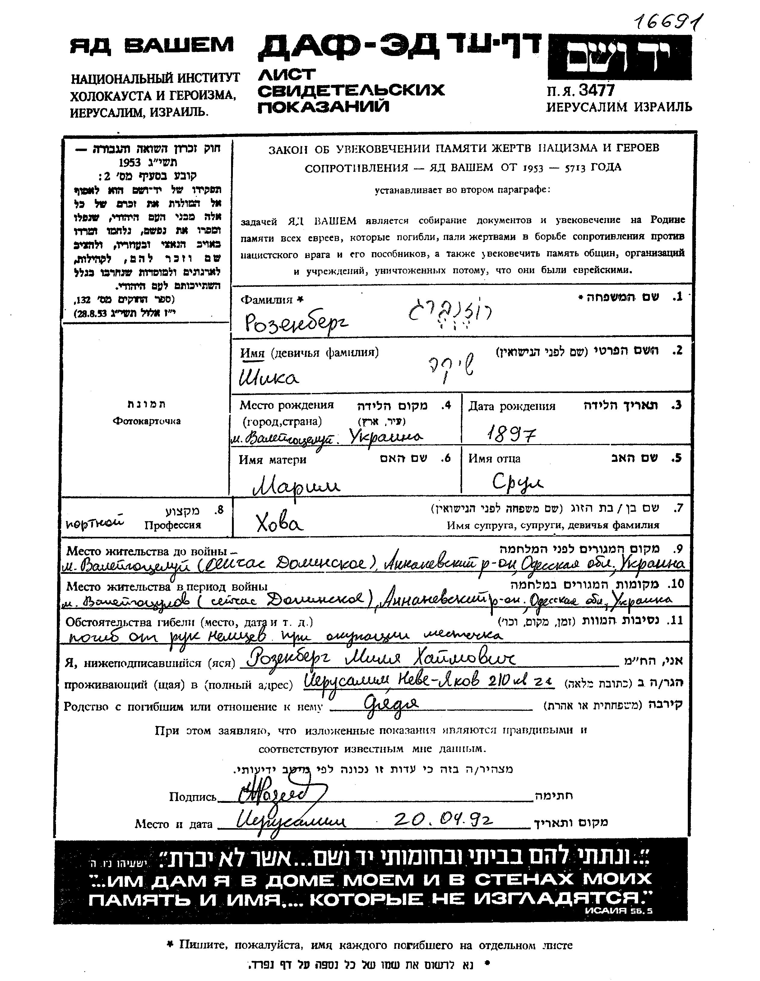 Rozenberg Shika 1897 Valegotsulovo, Ukraine (URSS) Feuille de témoignage