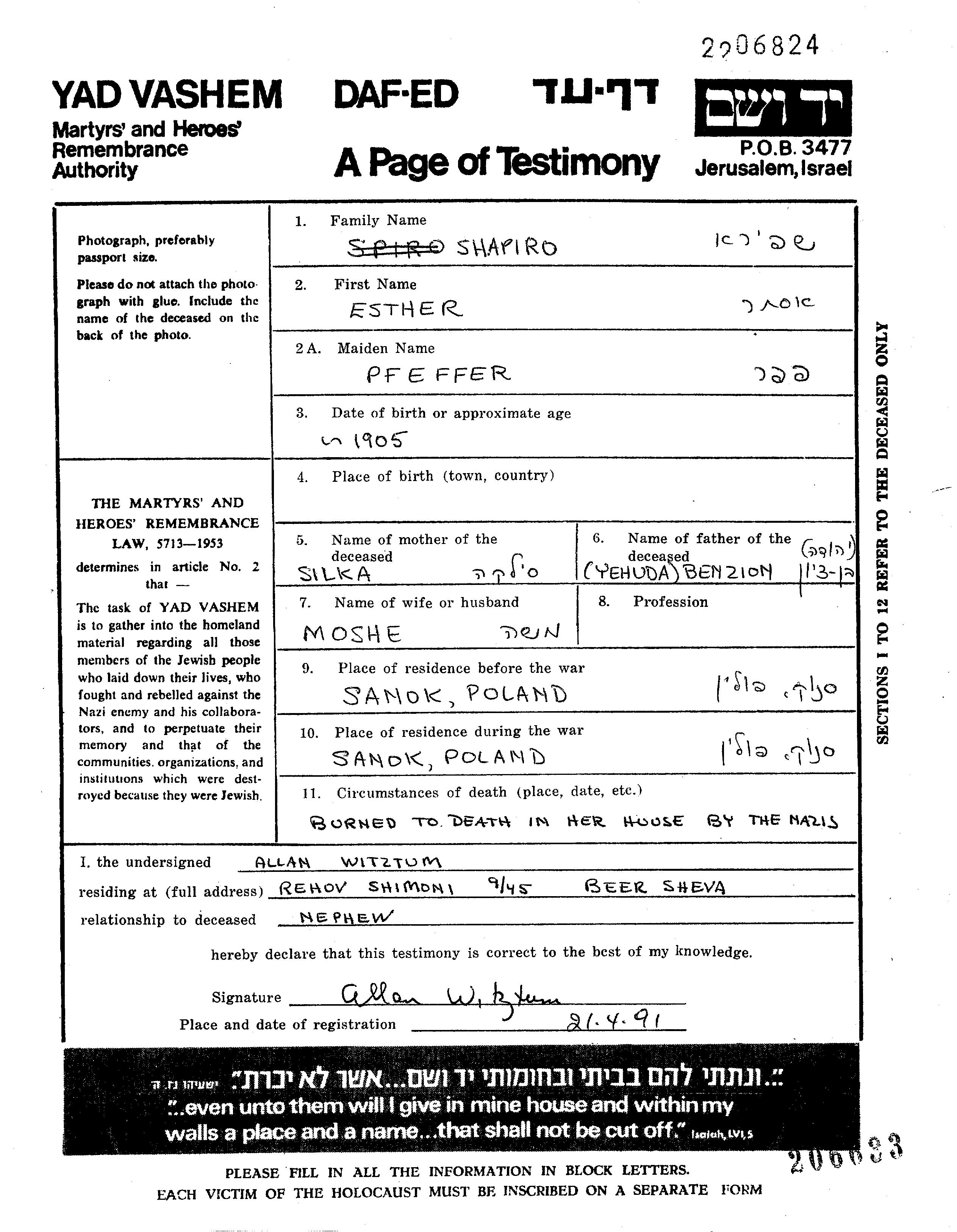 Esther Shapiro née Pfeffer est née fille de Benzion Yehuda et de Silka. Elle était Mariée à Moshe. Avant la seconde guerre mondiale elle vivait à Sanok, Pologne. Pendant la guerre, elle était à Sanok, Pologne.