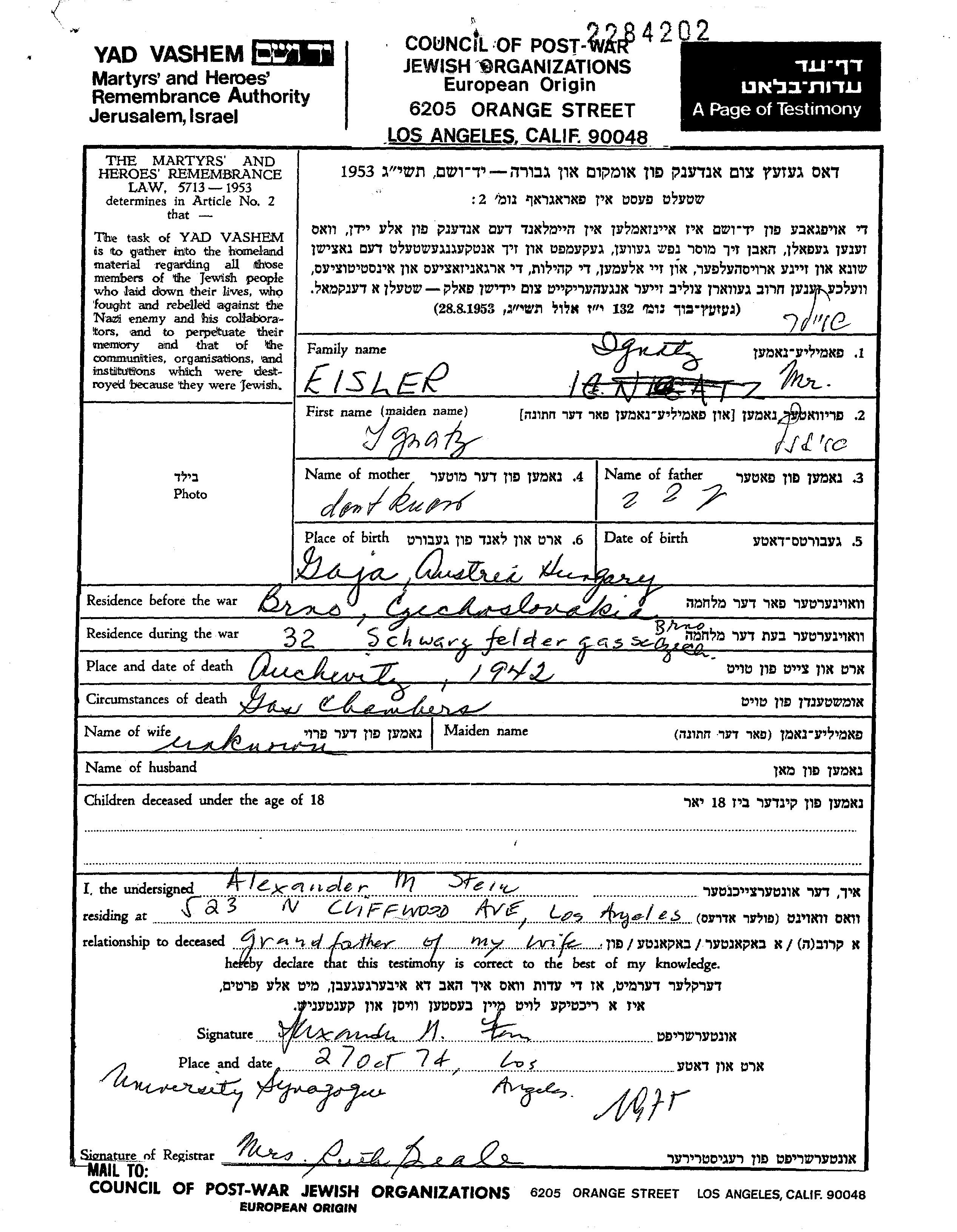 Eisler Ignatz Brno, Tchécoslovaquie Feuille de témoignage