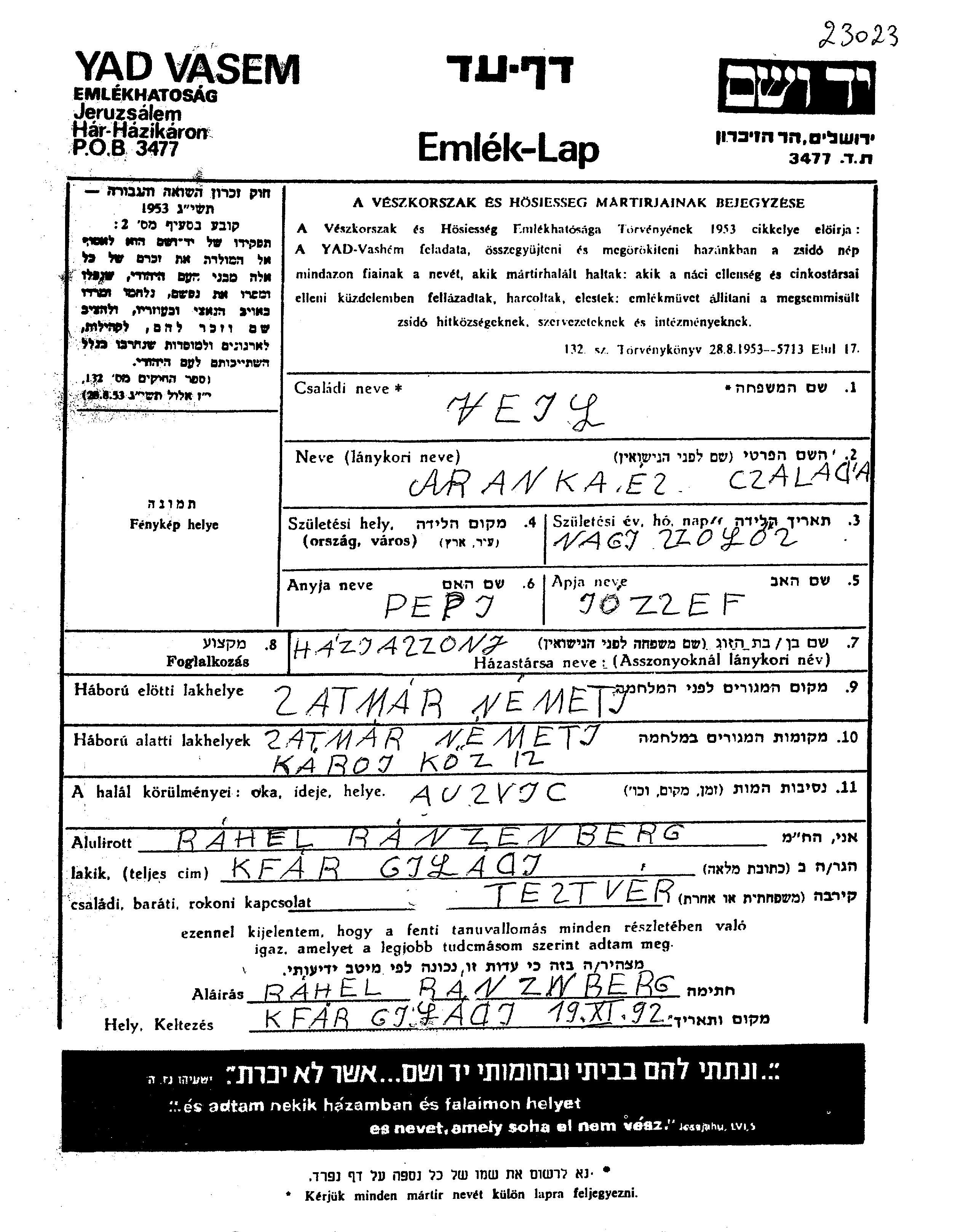 Veil Aranka Szatmar, Roumanie Feuille de témoignage