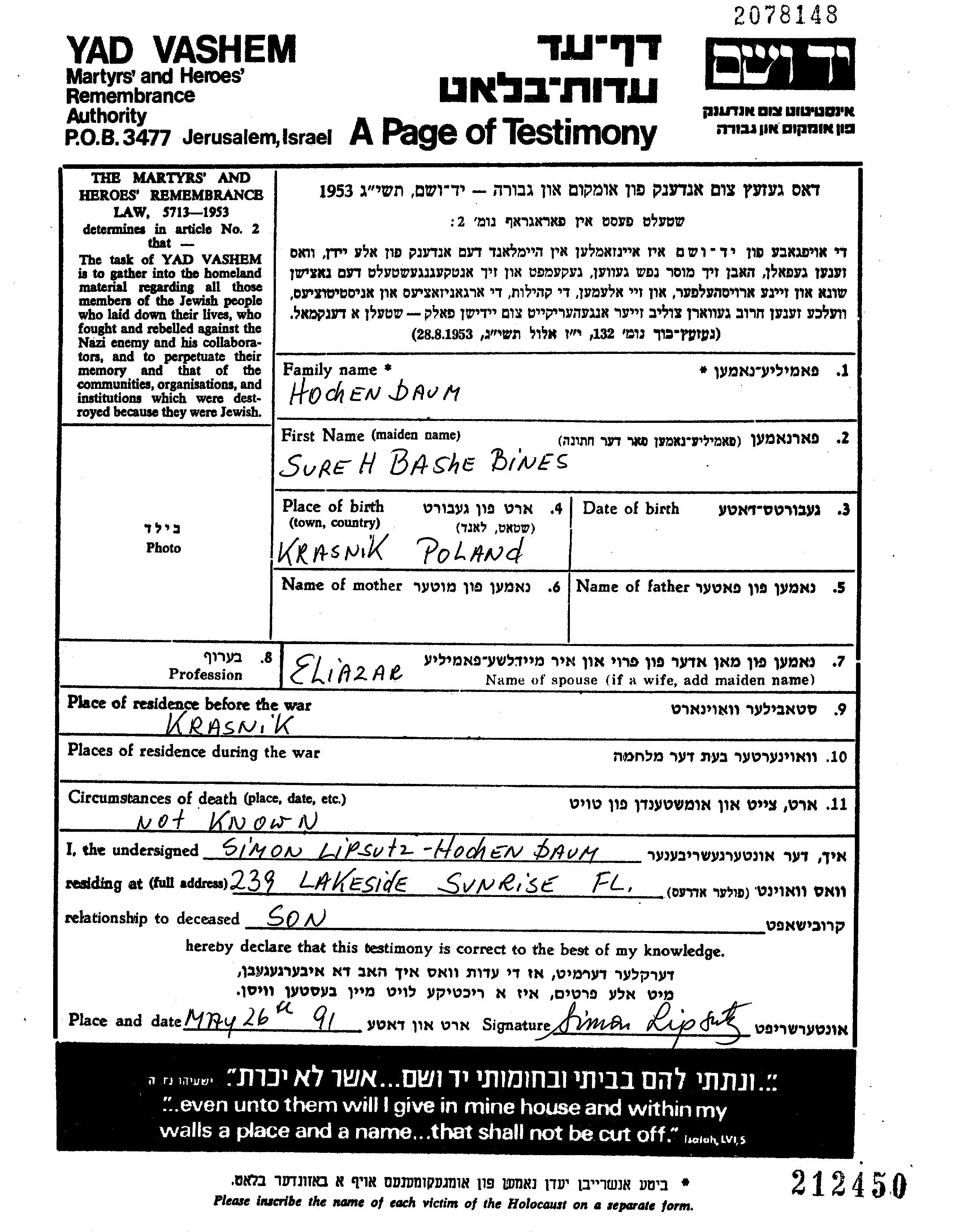 Hochenbaum Sureh Bashe Kraśnik, Pologne Feuille de témoignage