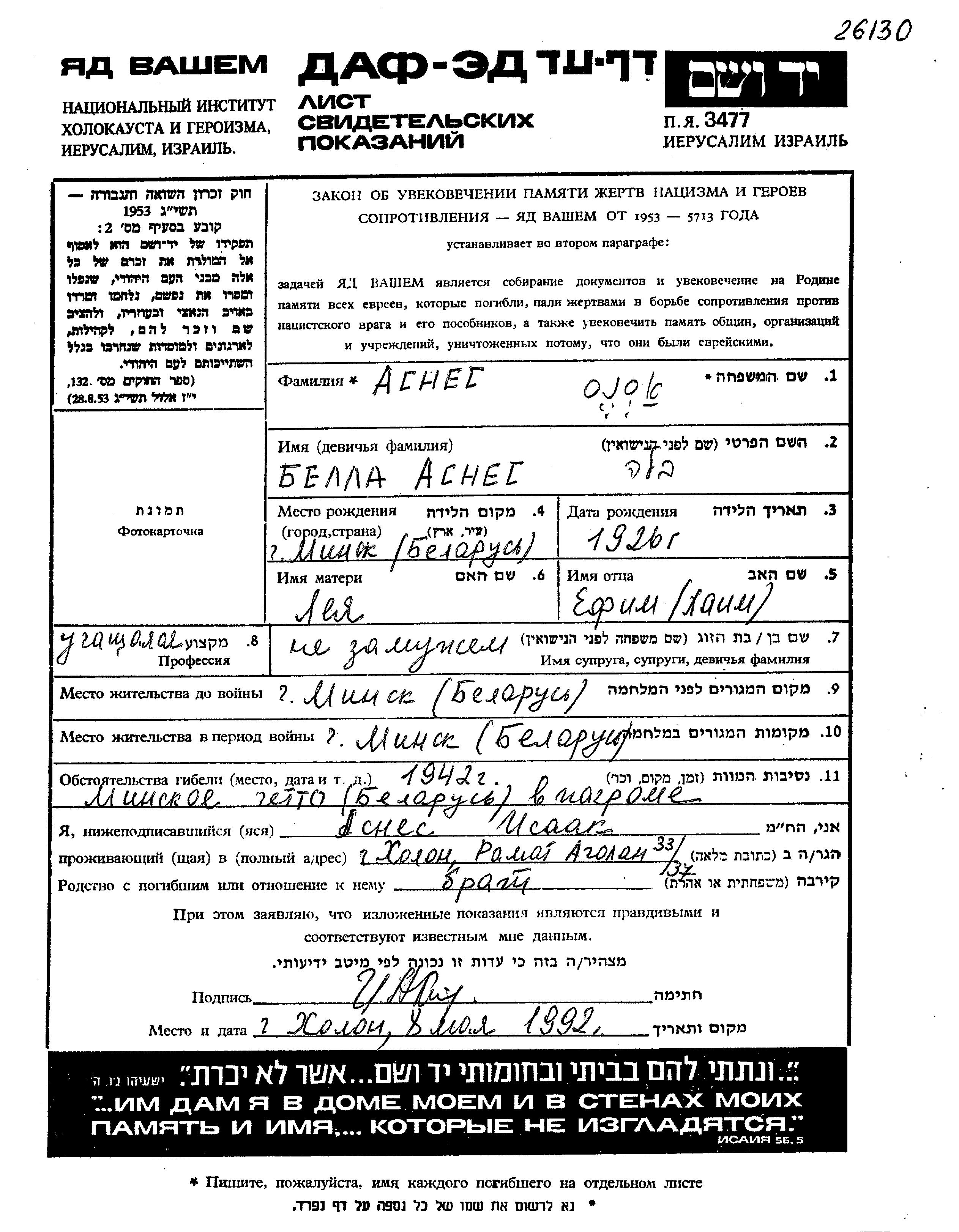 Asnes Bela 1926 Minsk, Bélorussie (URSS) Feuille de témoignage