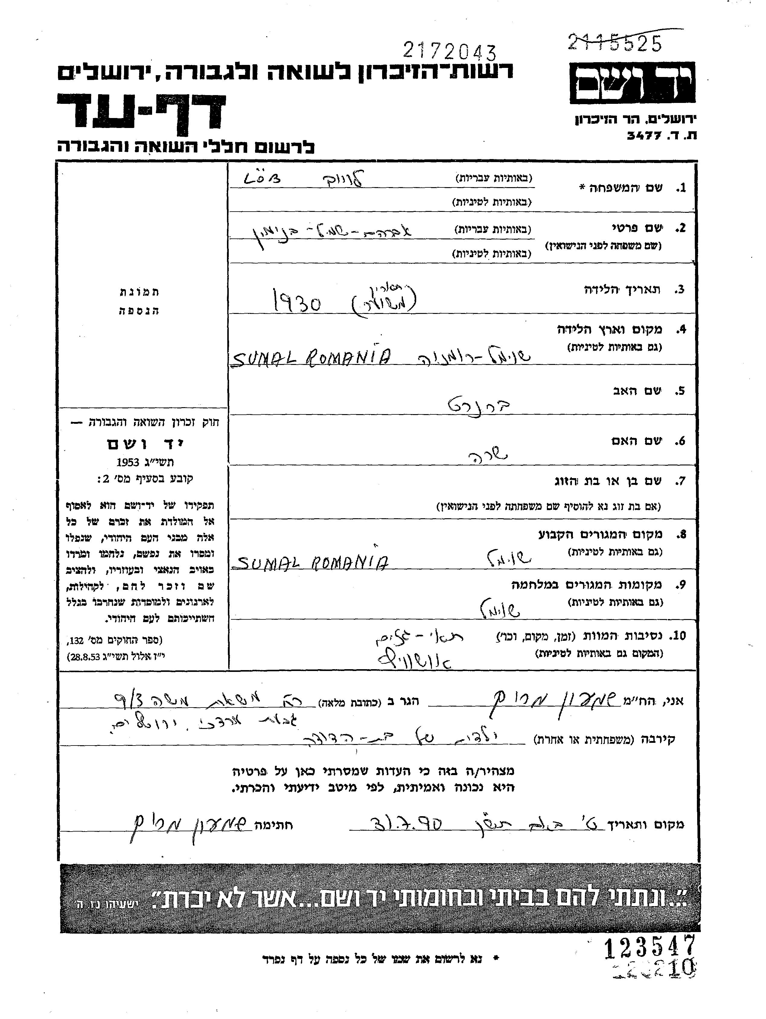 Shmil Avraham Beniamin Loeb Lev Loib est né à Sumal, Roumanie en 1930, fils de Bernat et de Sara née Diamantshtein. Il était Enfant. Avant la seconde guerre mondiale il vivait à Sumal, Roumanie. Au cours de la guerre, il était à Sumal, Roumanie.