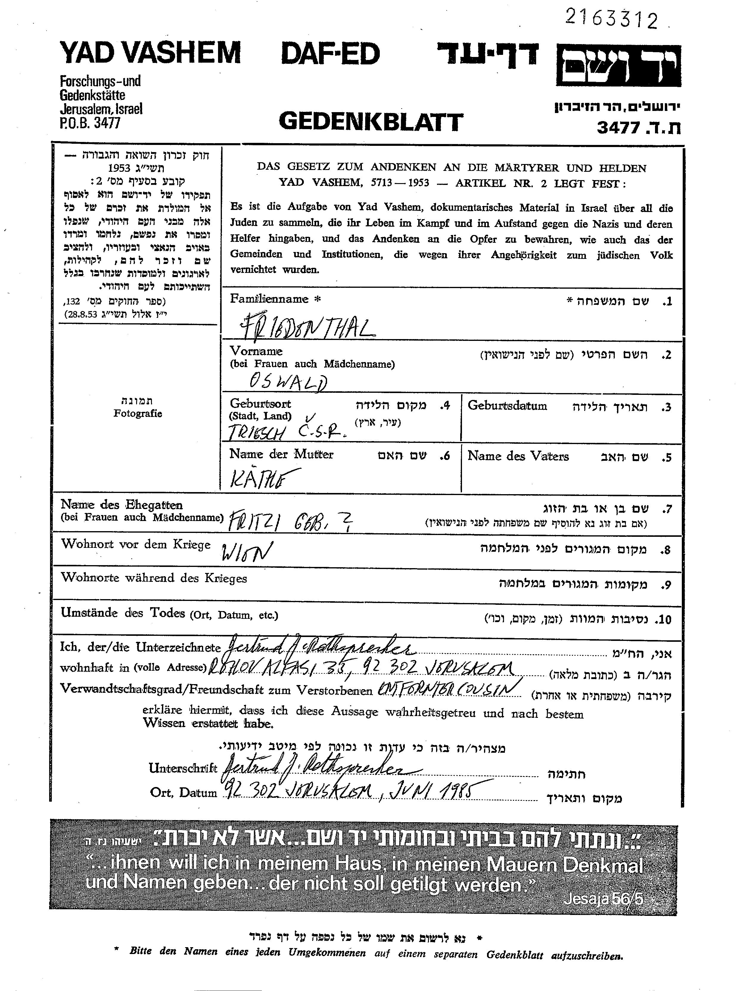 Osvald Friedenthal est né à Triesch, Tchécoslovaquie, fils de Kaethe. Il était Mariée à Fritzi Fritzi. Avant la seconde guerre mondiale il vivait à Wien, Autriche.