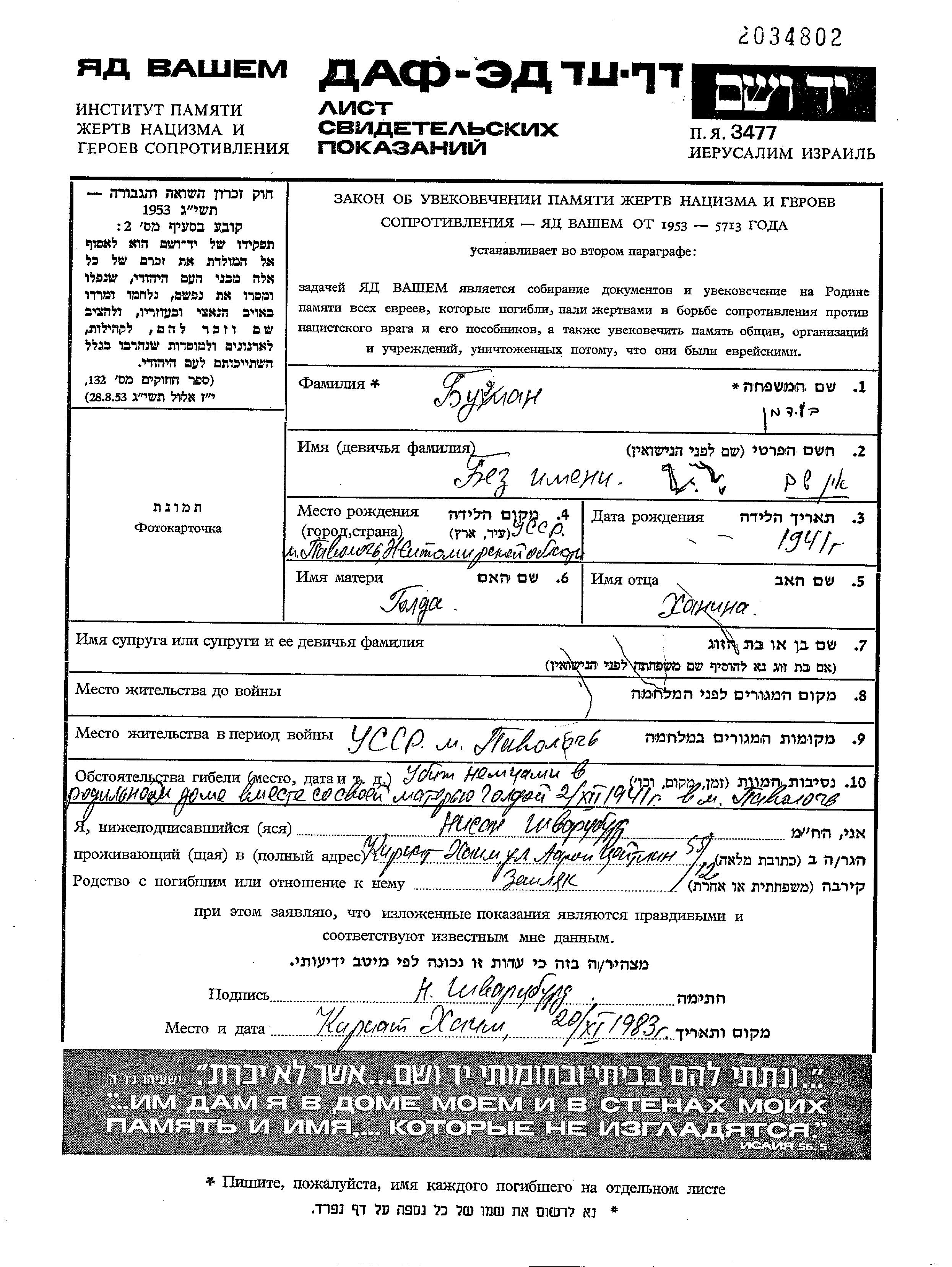 Budman prénom inconnu 1941 Pavoloch, Ukraine (URSS) Feuille de témoignage
