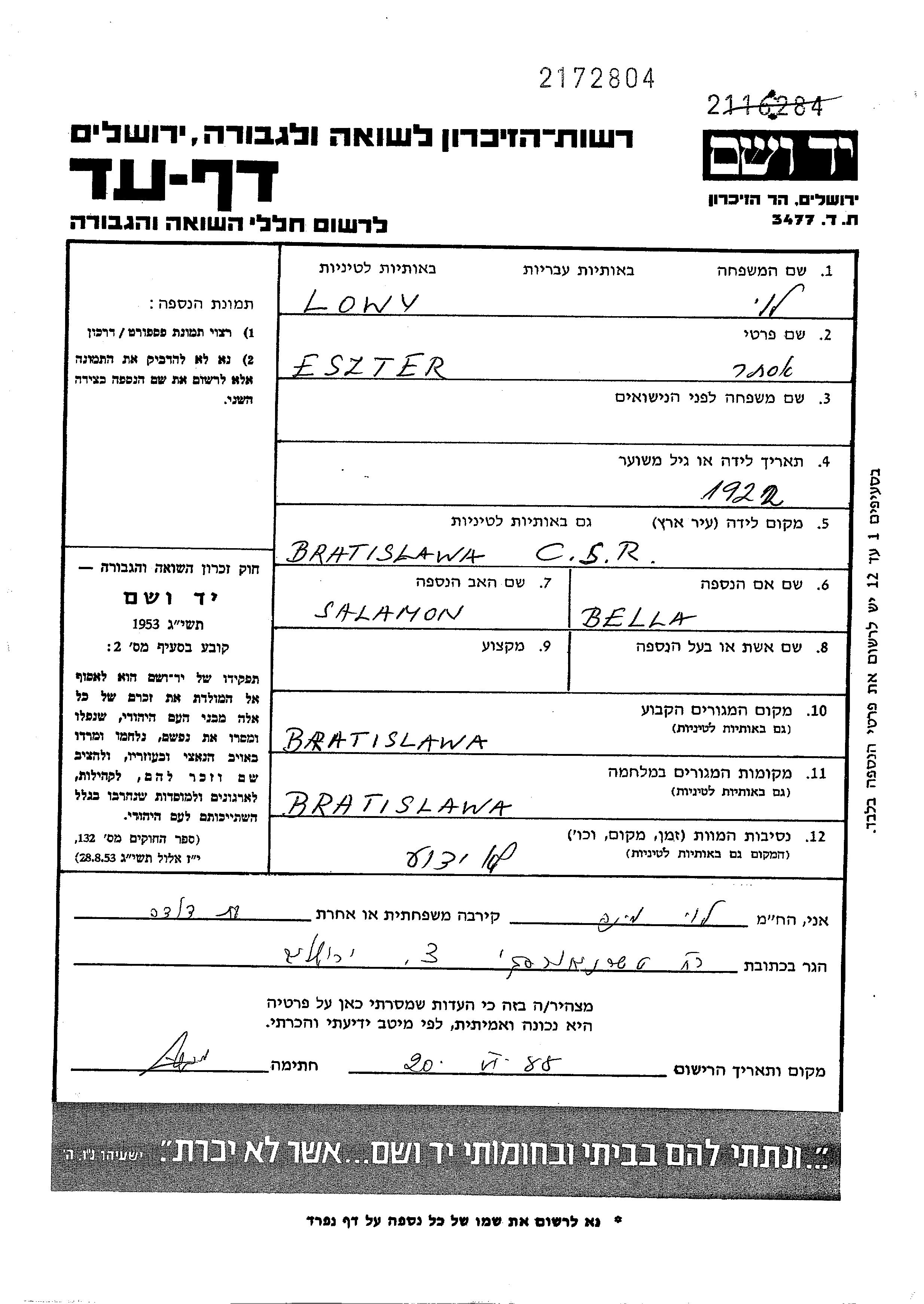 Lowy Eszter 1922 Bratislava, Tchécoslovaquie Feuille de témoignage
