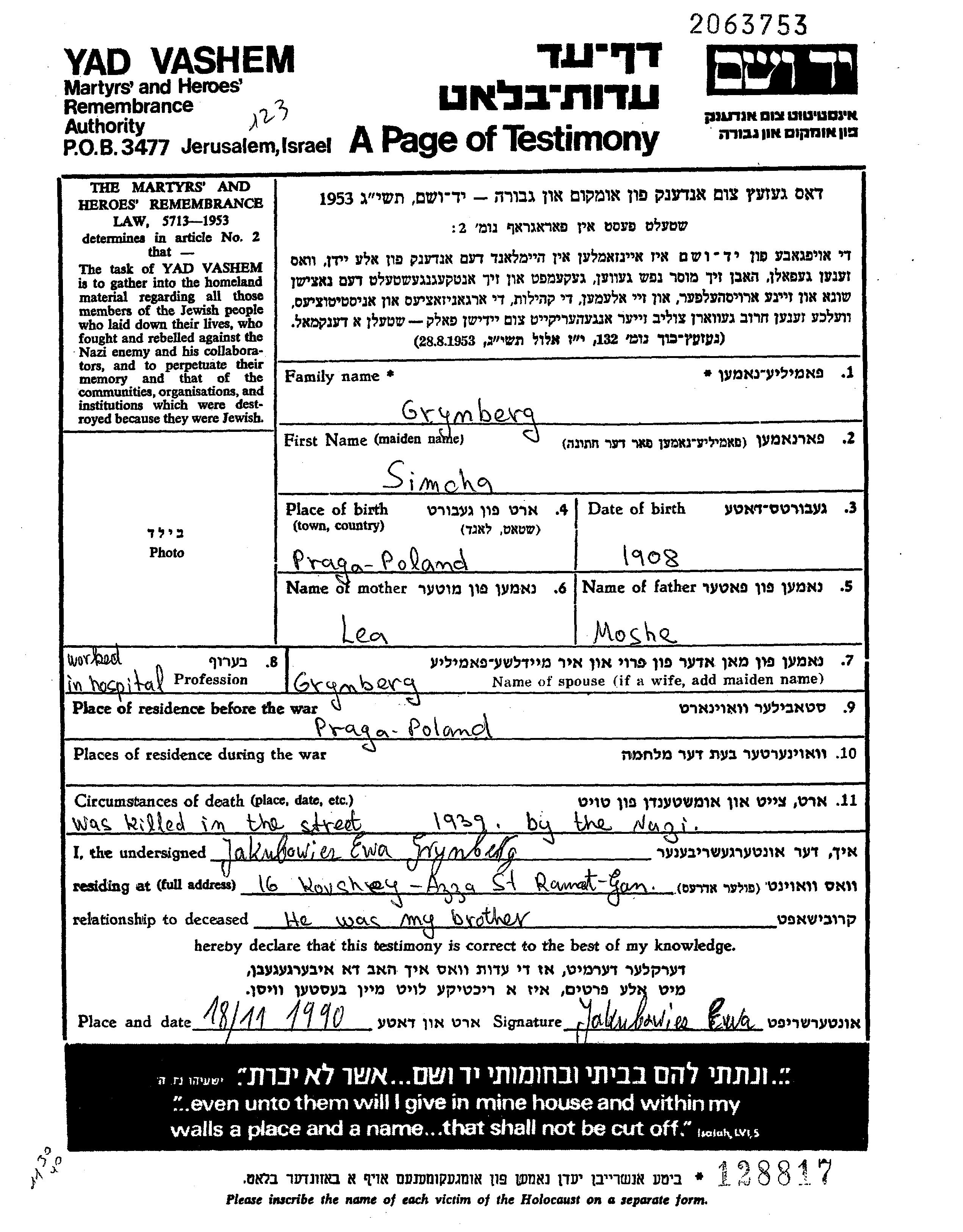 Grynberg Simcha 1908 Warszawa, Pologne Feuille de témoignage
