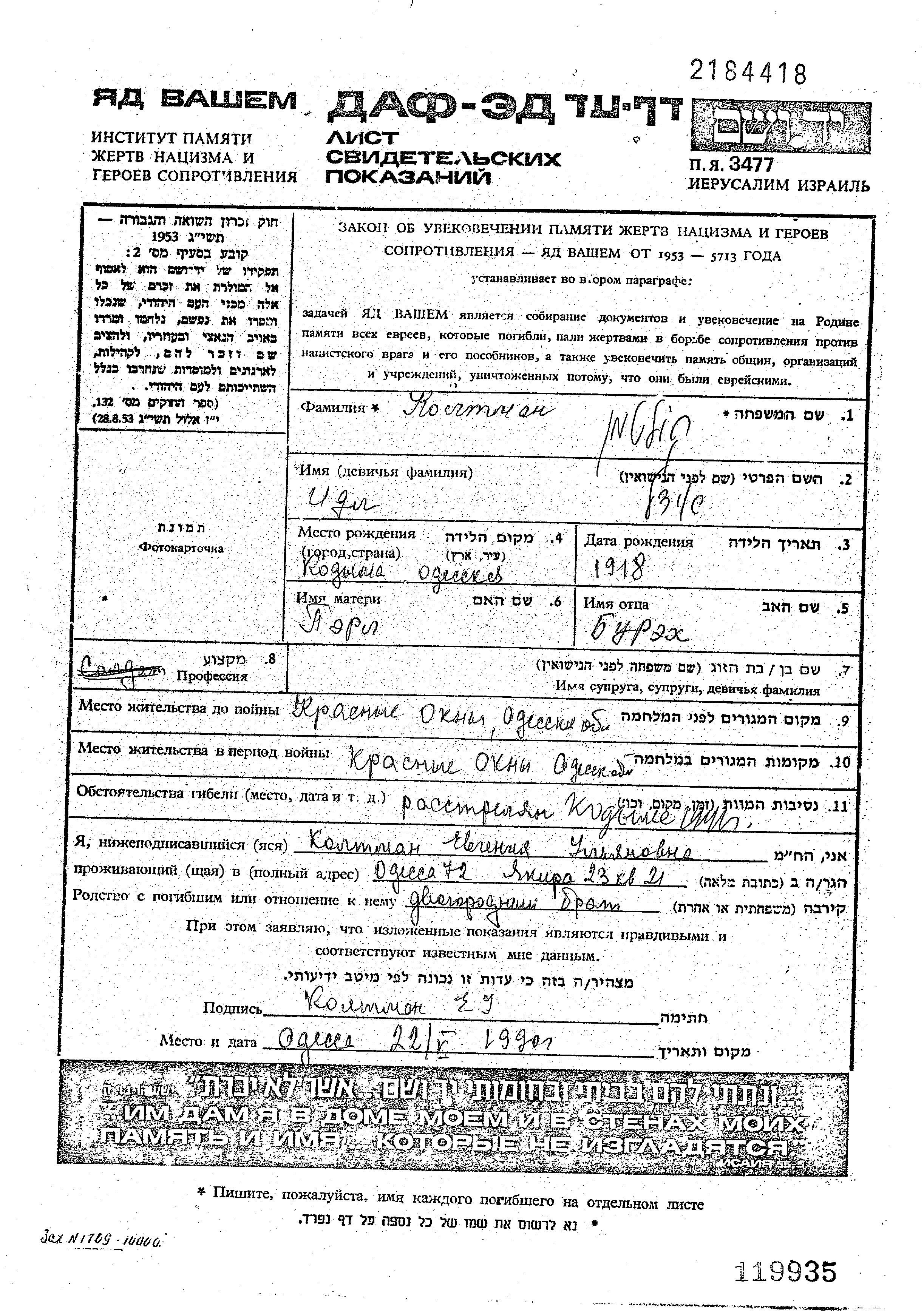 Idl Koltman est né à Kodyma, Ukraine (URSS) en 1918, fils de Burekh et de Perl. Avant la seconde guerre mondiale il vivait à Krasnyye Okny, Ukraine (URSS). Au cours de la guerre, il était à Krasnoye, Russie (URSS).