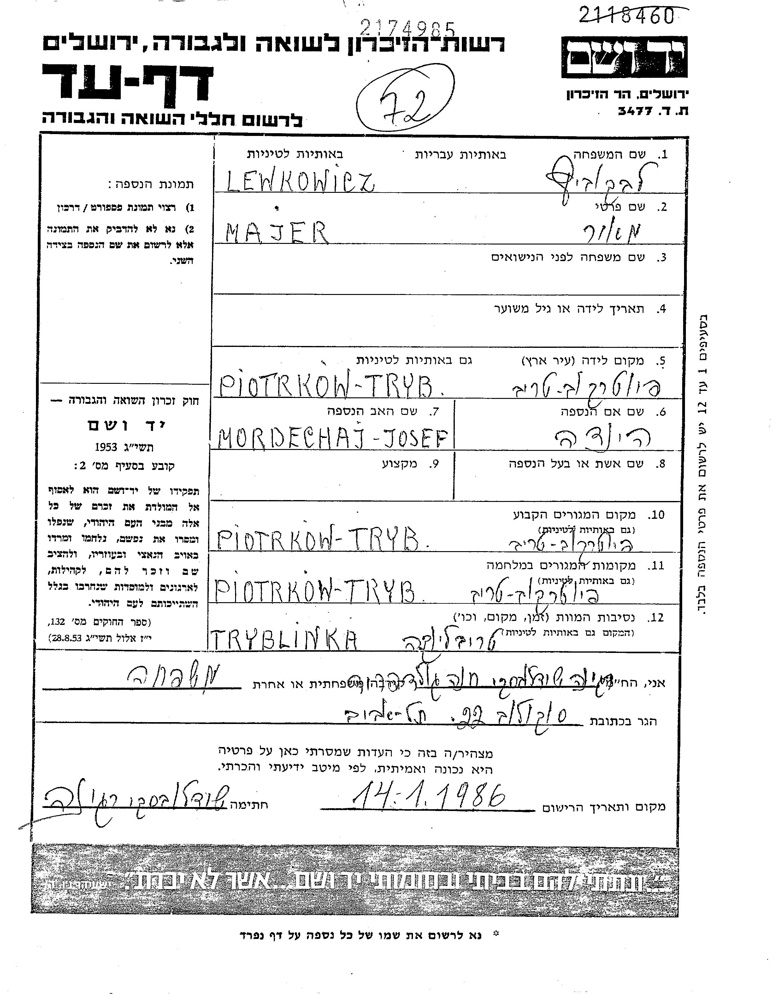 Lewkowicz Majer Piotrkow Trybunalski, Pologne Feuille de témoignage