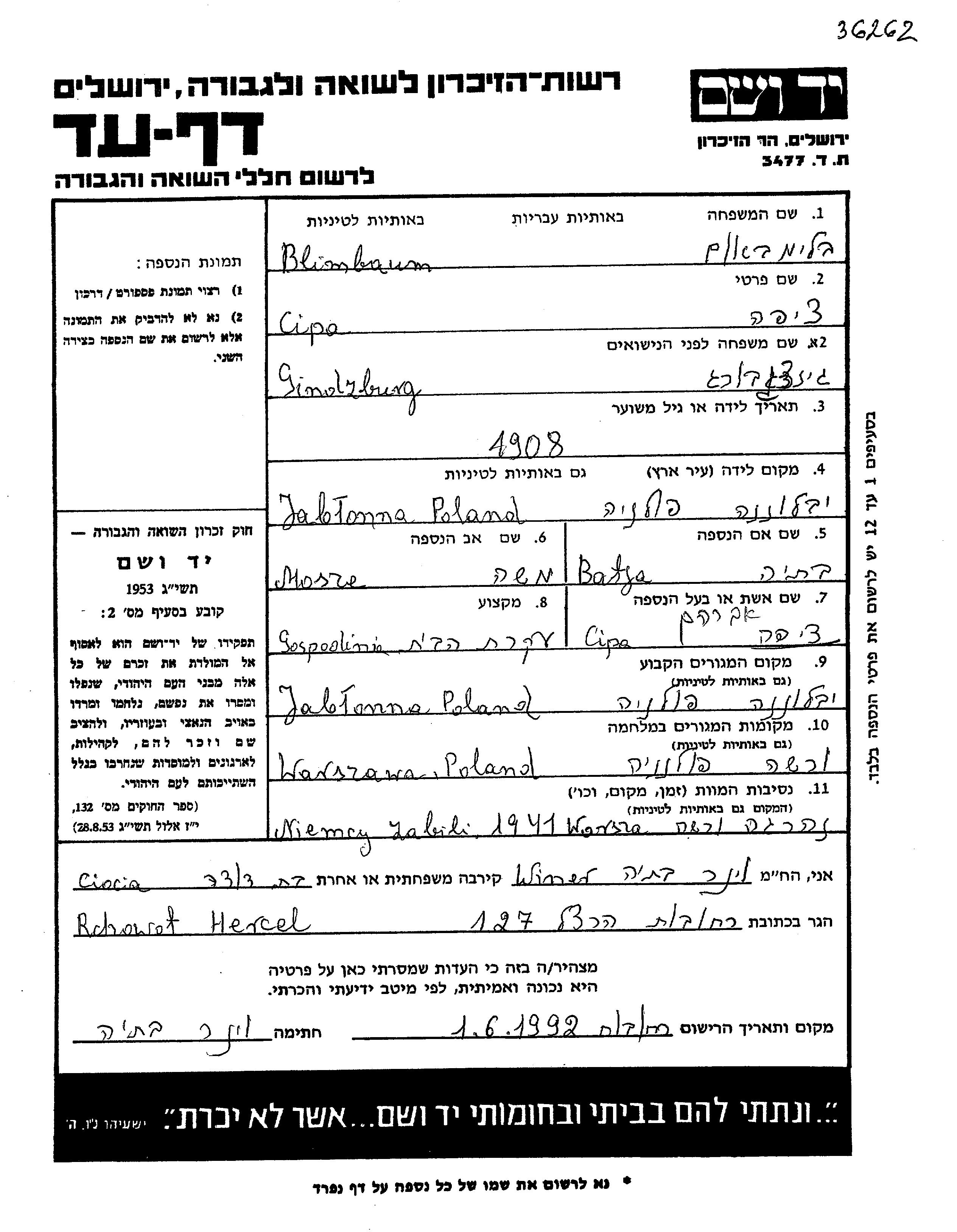 Blimbaum Cipa 1908 Jablonna, Pologne Feuille de témoignage