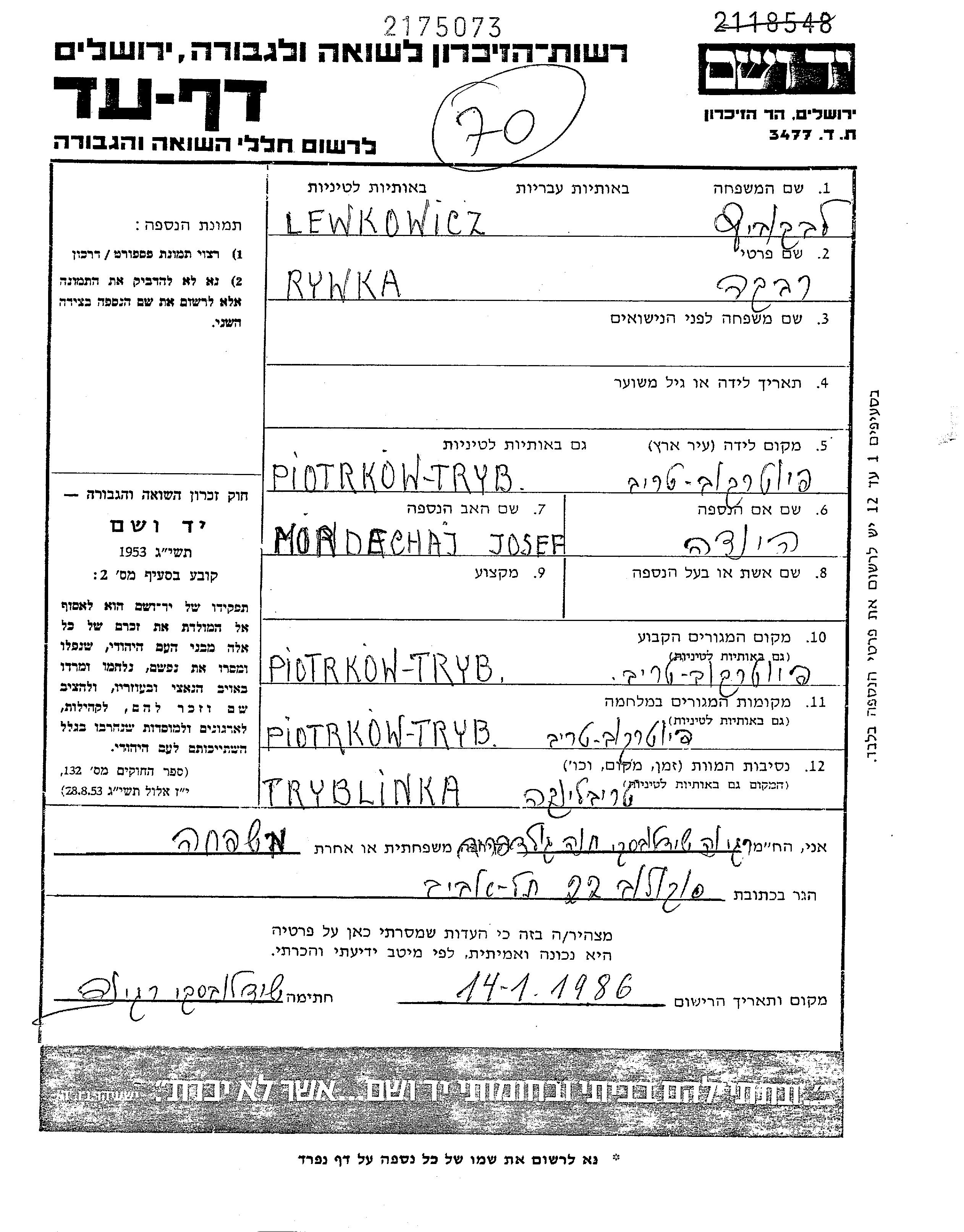 Lewkowicz Rywka Piotrkow Trybunalski, Pologne Feuille de témoignage