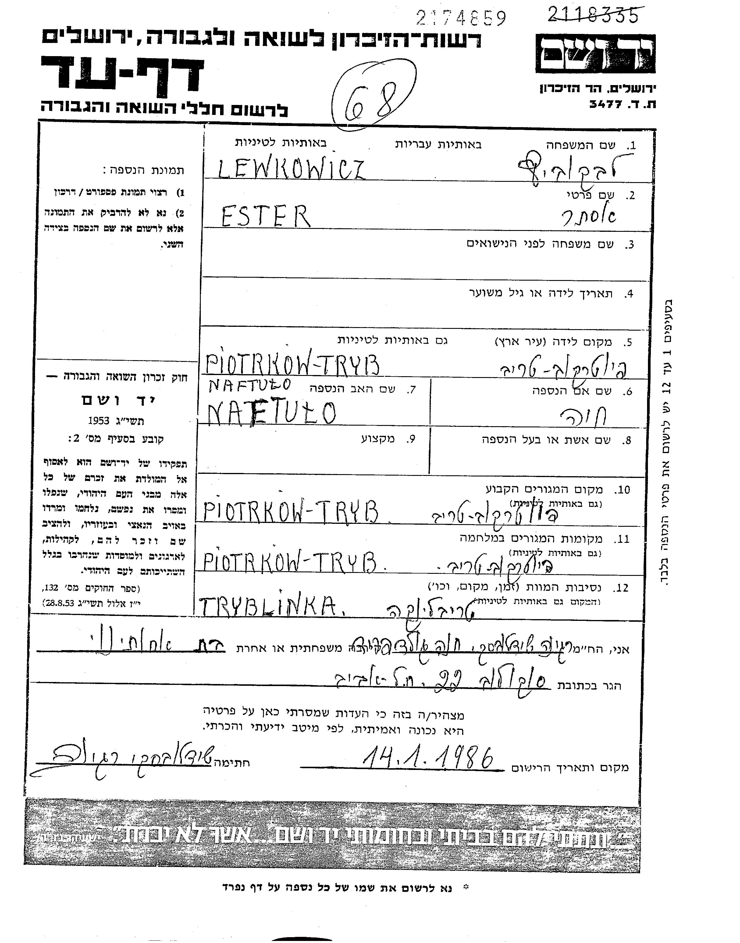 Lewkowicz Ester Piotrkow Trybunalski, Pologne Feuille de témoignage
