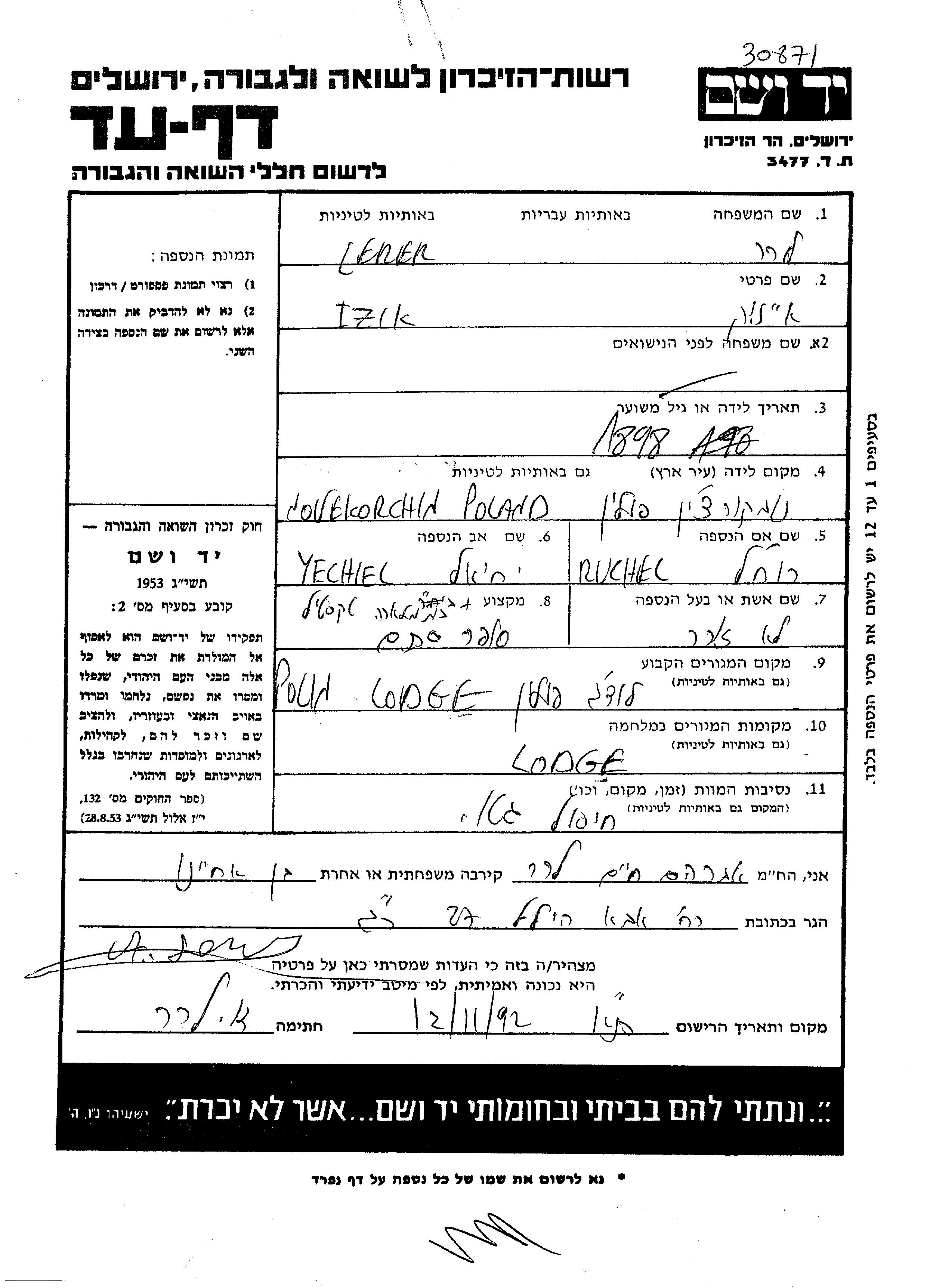 Lerer Izik Aizik 1898 Lodz, Pologne Feuille de témoignage