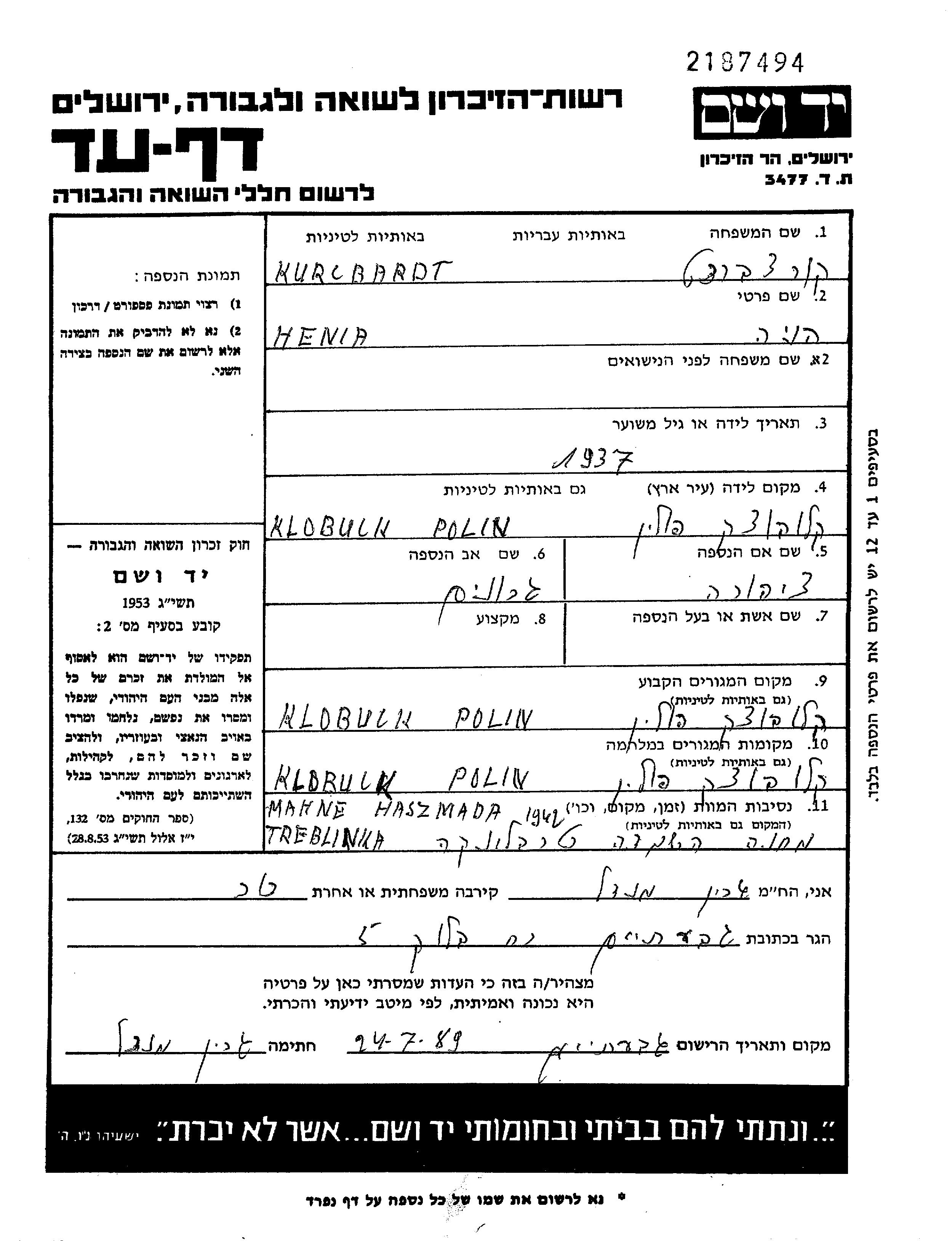 Yad Vashem - Pages of Testimony Names Memorial Collection