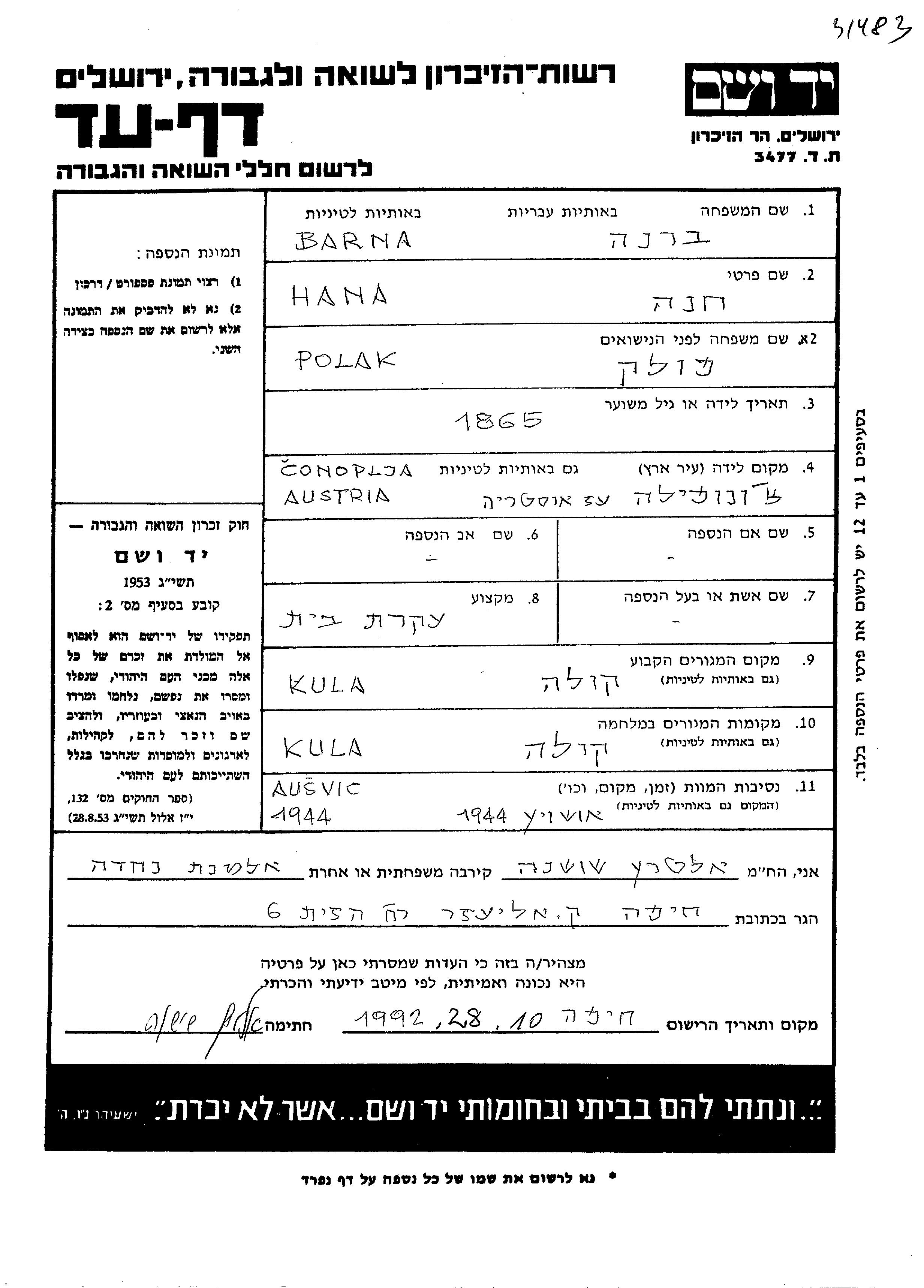 Hana Barna née Polak est née à Conoplja, Yugoslavie en 1865. Elle était Femme au foyer et Mariée. Avant la seconde guerre mondiale elle vivait à Kula, Yugoslavie. Pendant la guerre, elle était à Kula, Yugoslavie.